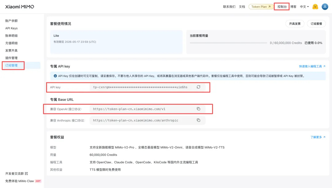 小米 MiMo 订阅入口[9] 就在这里,购买完成后在「控制台 → 订阅管理」里可以看到你的 API Key 和访问地址,记好这两个值,后面要用: