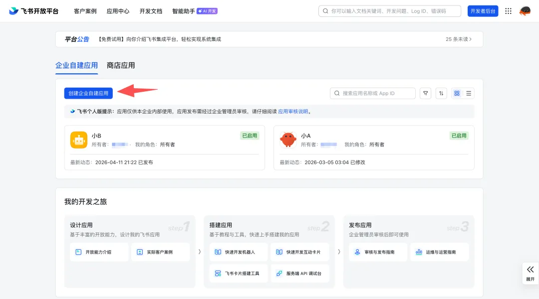 打开 飞书开放平台[10],用你的个人飞书账号登录。