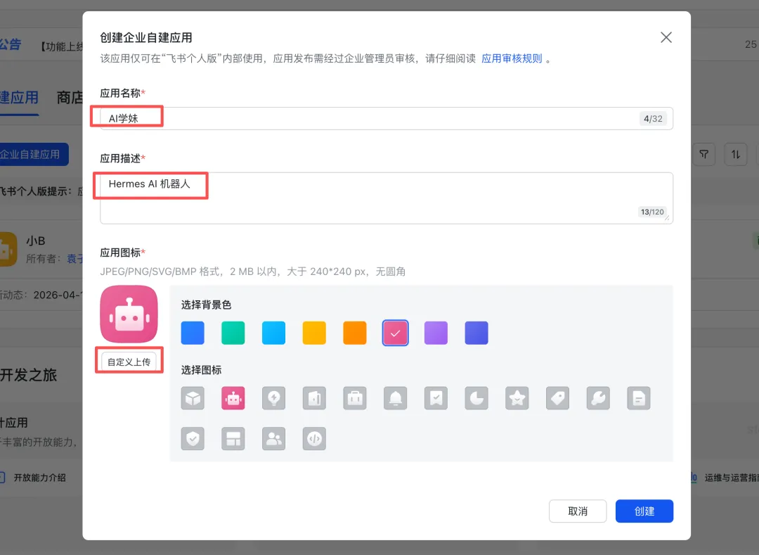 应用名称:随便取, Hermes 助手应用描述:一句话说明它做什么,发布审核时管理员能看到 应用图标:可选,但建议传一张,以后在飞书对话框里会更显眼