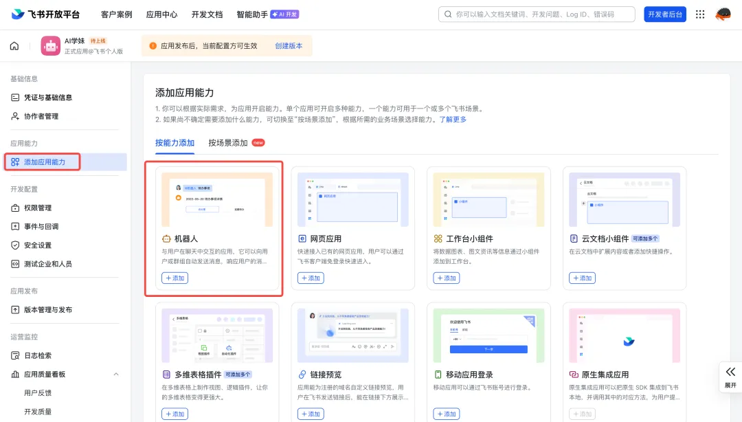 默认创建出来的应用是没有机器人身份的,它只是一个壳。你需要在左侧菜单里找到「添加应用能力」,把「机器人」勾上。