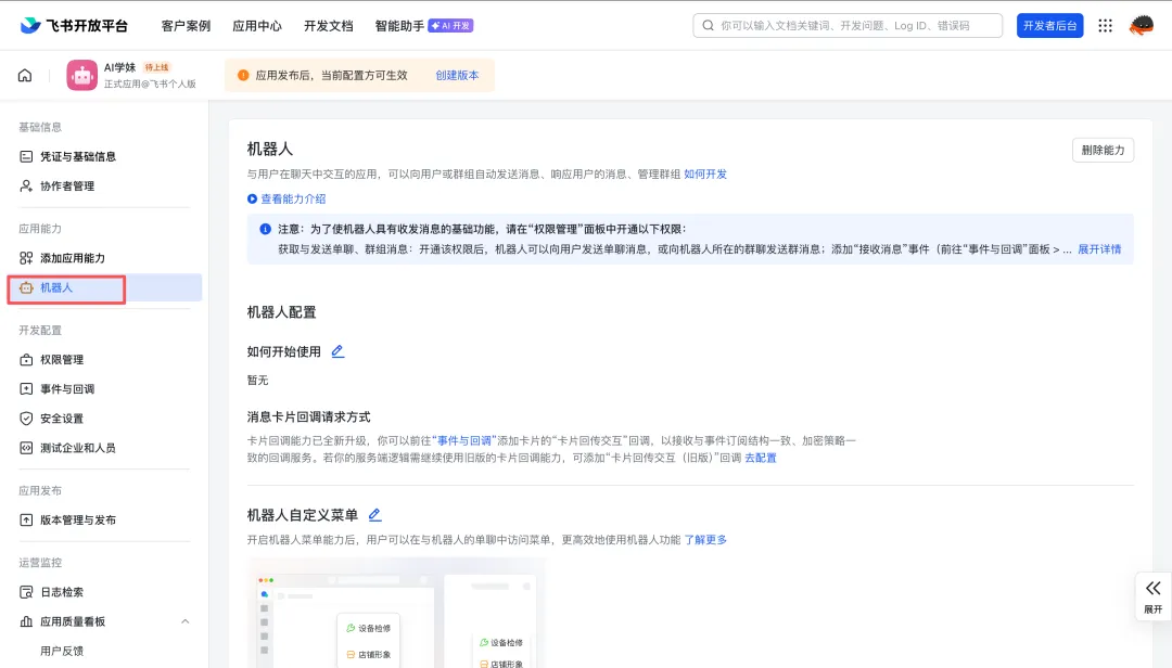 这一步完成后,应用就同时具备「开放平台应用」和「机器人」两个身份了。Hermes 都是通过机器人身份往外发消息,所以这一步是必须的。