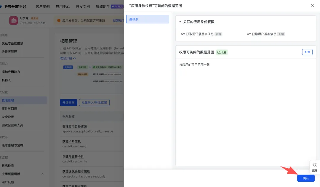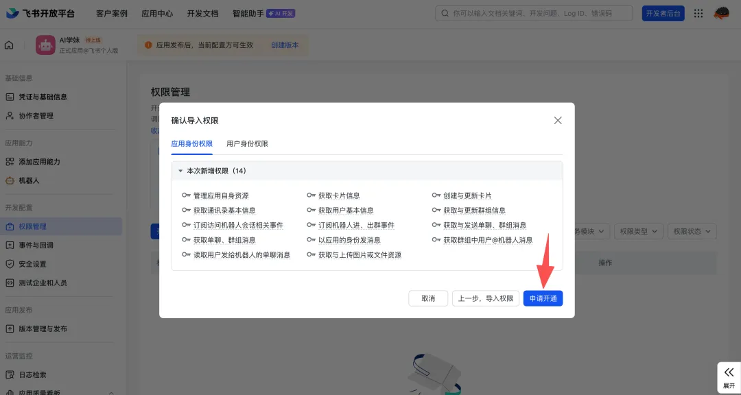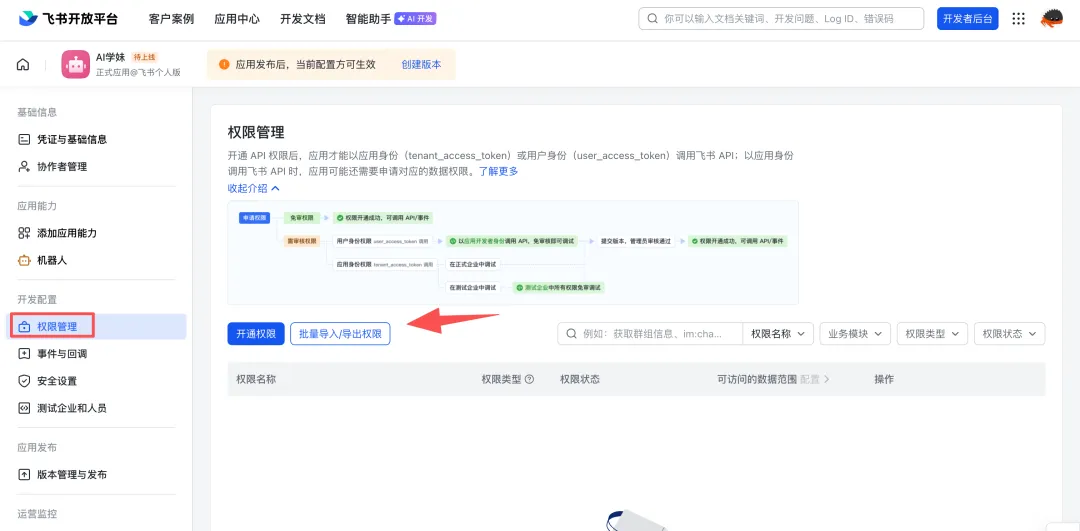 权限开通不会立即生效,要等到下一步「发布版本」被管理员审核通过之后才真正可用。