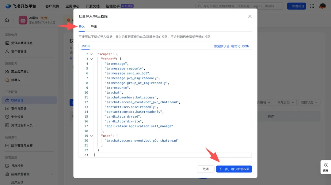 进入「权限管理 → 开通权限」,建议直接复制下面这段 JSON 通过「批量导入」的方式配置: