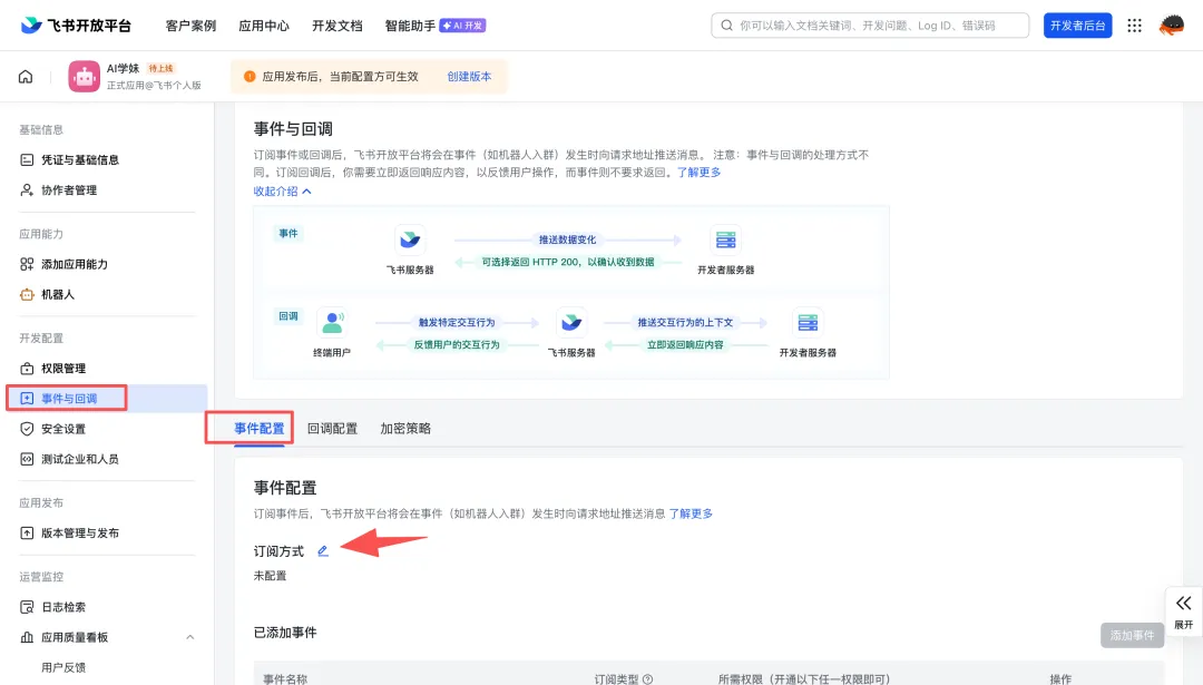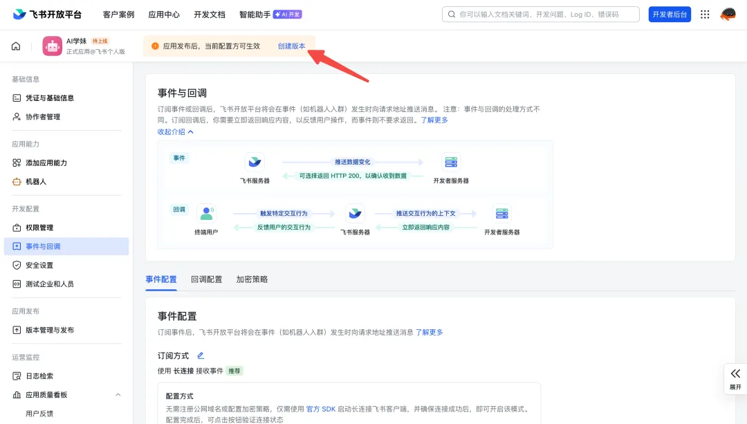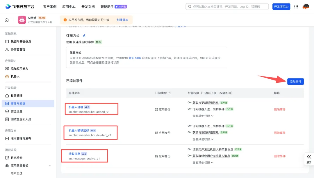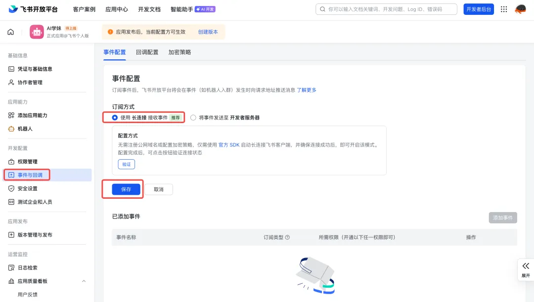 在左侧菜单找到「事件与回调 → 事件配置」,把传输方式切换成「使用长连接接收事件」: