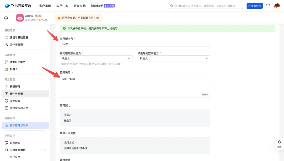 这一步最容易被忘。权限和事件都配好了,但只要没发布版本,机器人在群里还是哑巴。