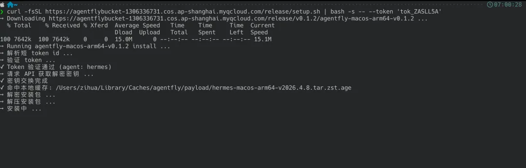 curl -fsSL https://agentflybucket-1306336731.cos.ap-shanghai.myqcloud.com/release/setup.sh | bash -s -- --token 'tok_ZASLL5A'执行后会看到下面这样的输出: