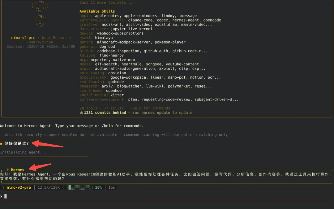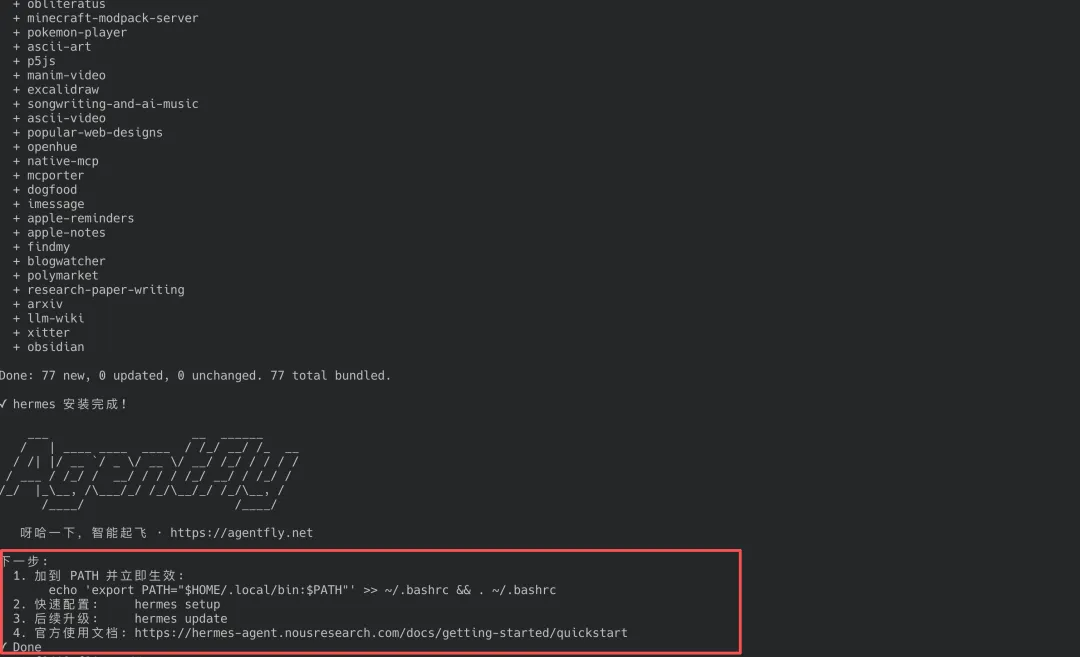 Hermes 支持在 Windows(WSL)、MacOS 和 Linux 上安装,官方安装脚本[11] 很简单,只需要在终端里执行下官方的安装命令就好了,这里我就不贴官方命令了,有需要可以去官方文档查看。