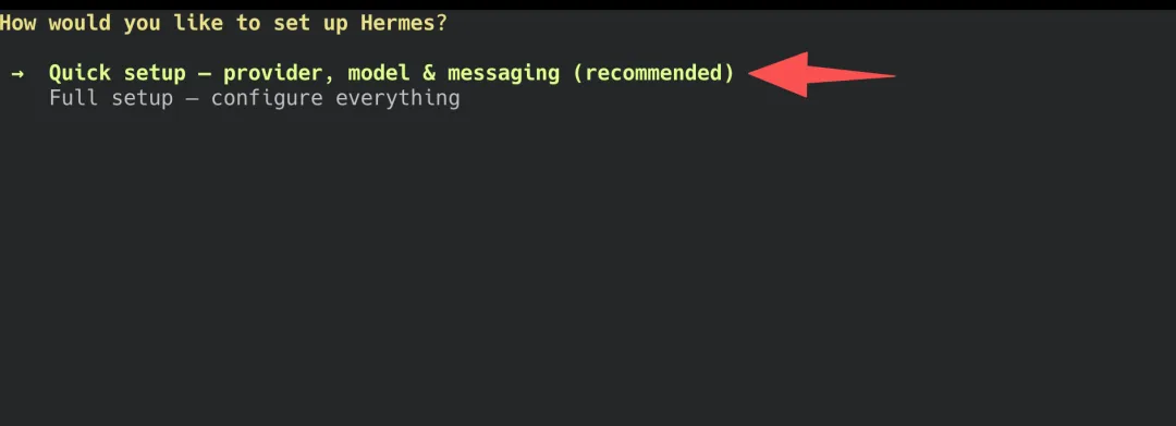 运行 hermes setup 进入交互式配置界面,选择 Quick Setup 走快速配置流程: