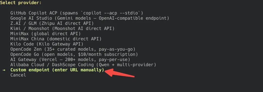 选择 More Providers...,然后找到 Custom endpoint 选项:
