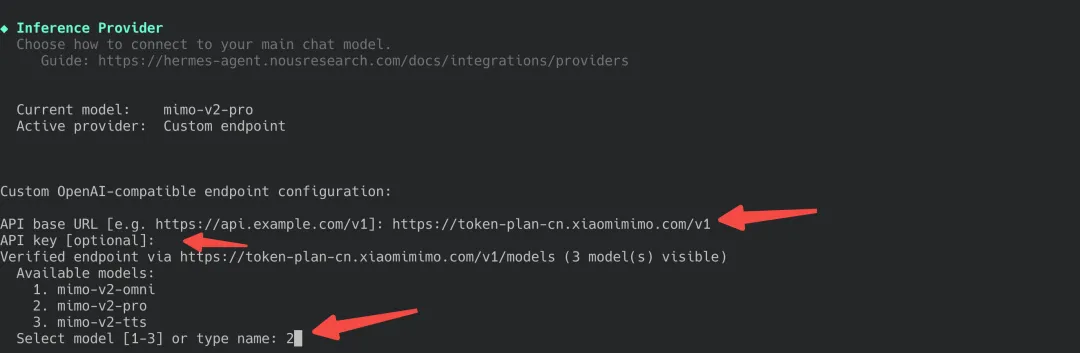 把前面拿到的小米 MiMo 的 API Key 和访问地址填进去,模型选 2,回车后会提示配置成功: