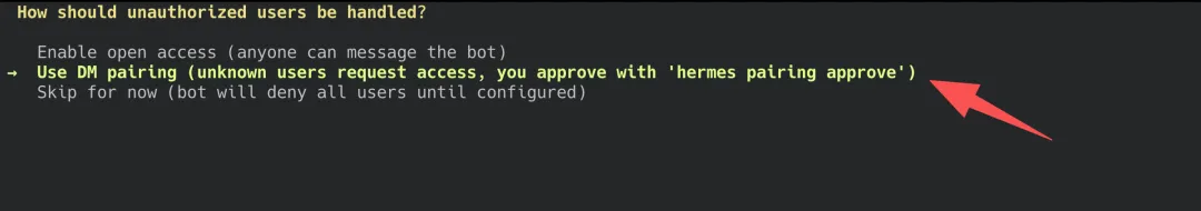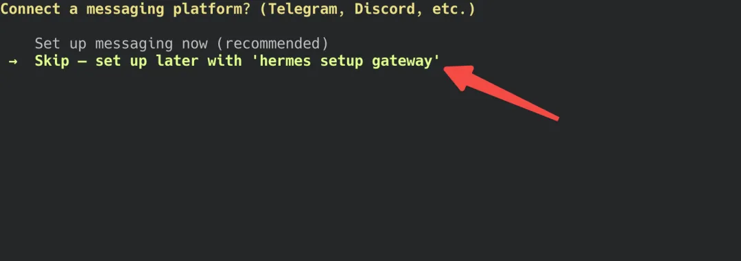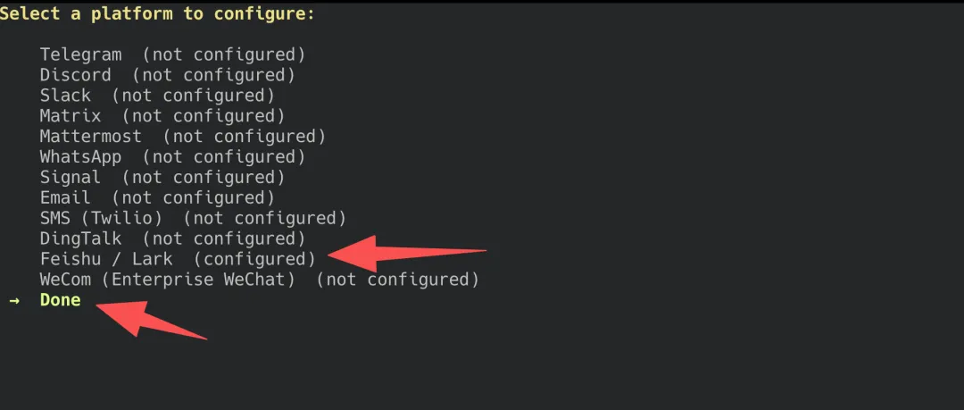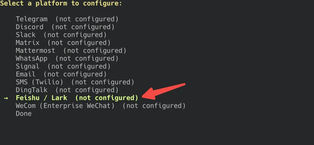 接下来把飞书机器人接到 Hermes 上,我们就可以在飞书里直接给它下指令了。运行下面的命令进入配置界面:
