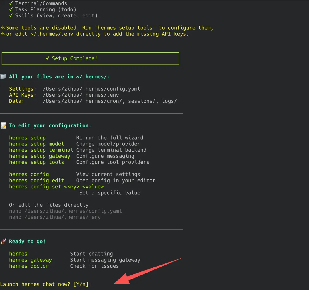 最后会问你是否进入 hermes chat,输入 y 进入命令行聊天: