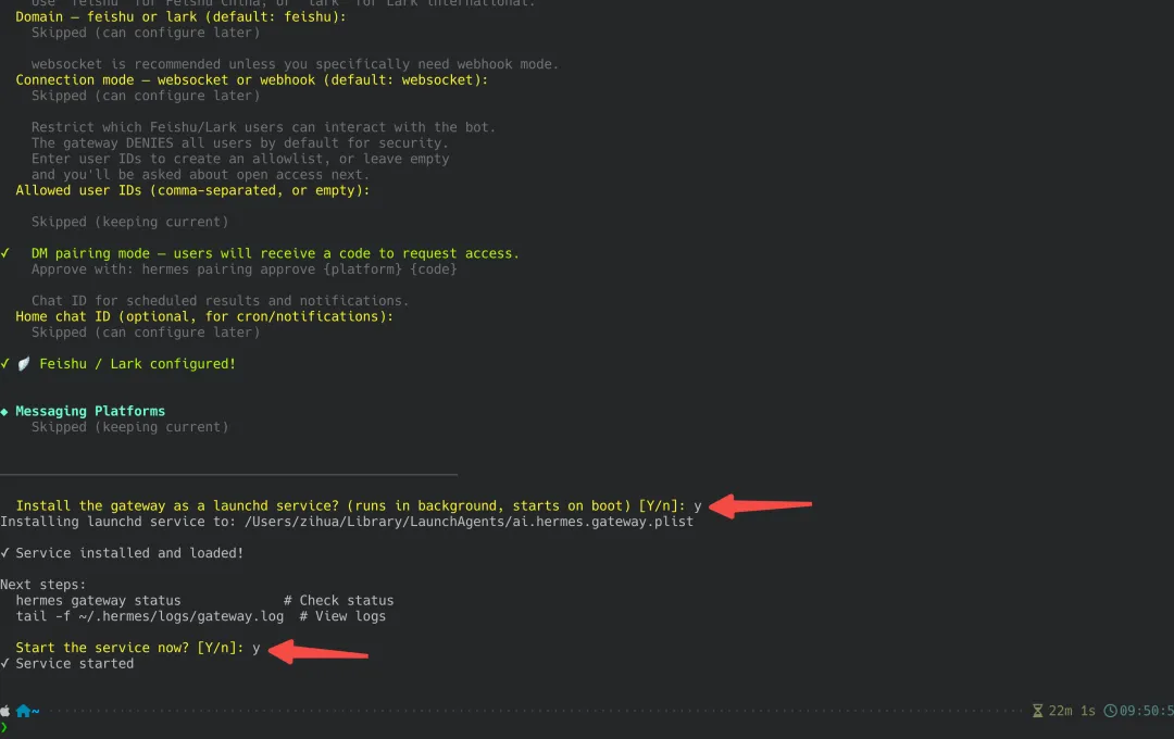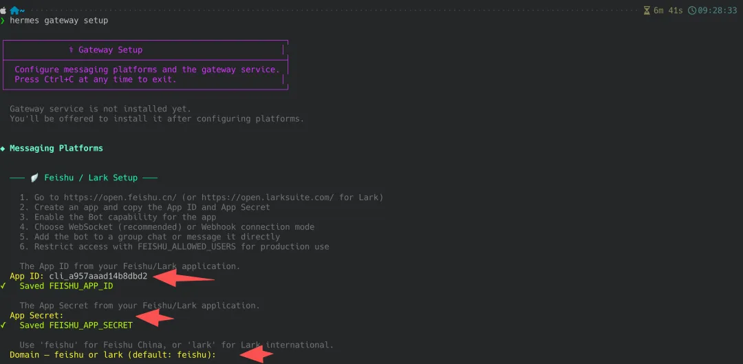 把前面拿到的飞书机器人 App ID 和 App Secret 填进去,然后一路回车确认: