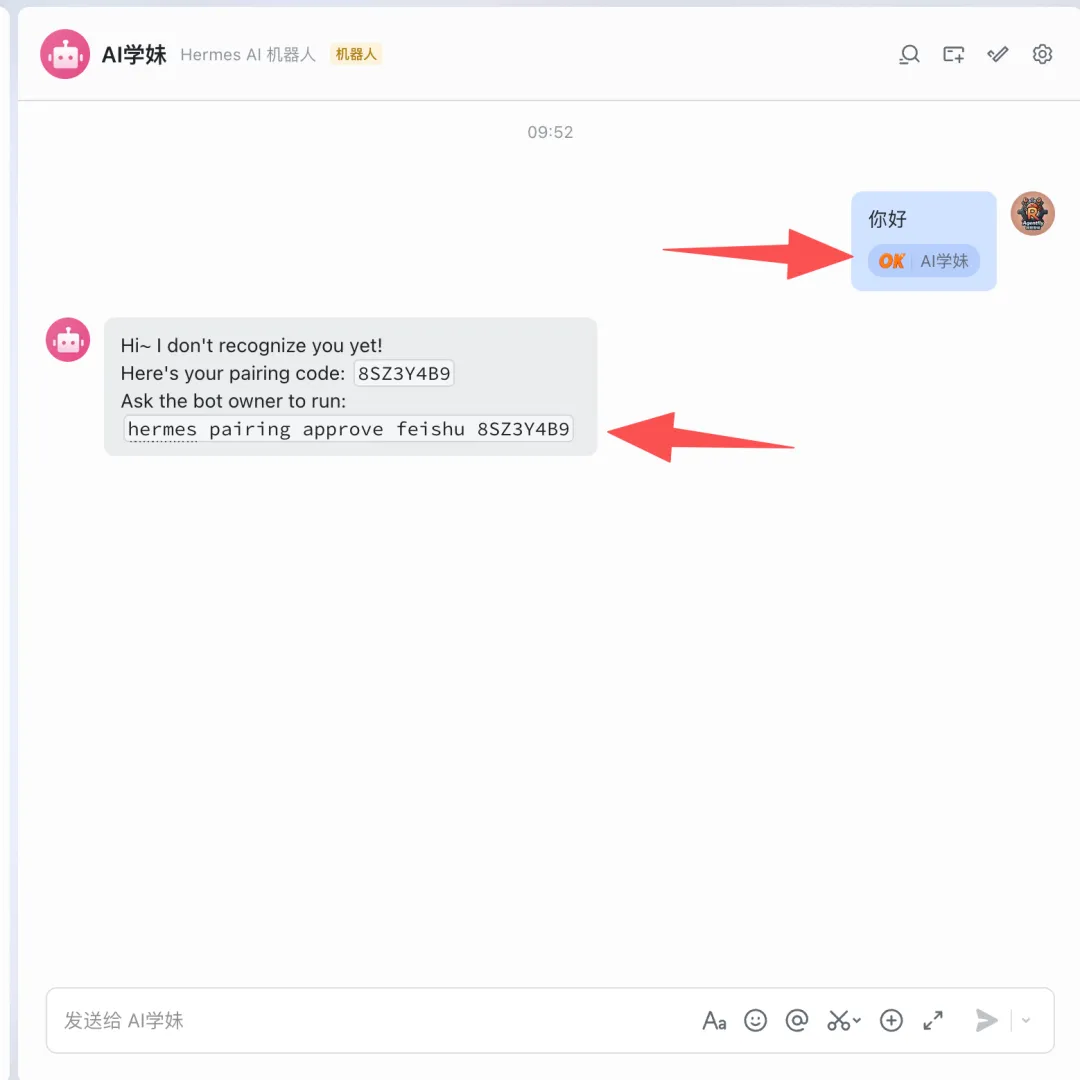 接下来到飞书上找到你的机器人,随便发条消息试试,它会回复一段配对命令: