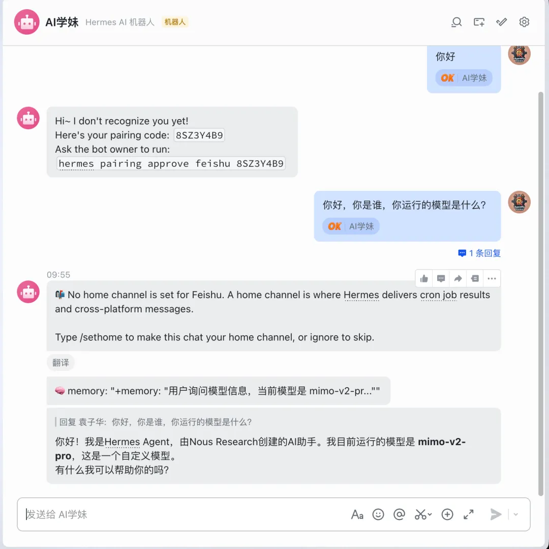 现在你就可以在飞书上直接和 Hermes 聊天了,看到它正常回复消息,说明一切都跑通了: