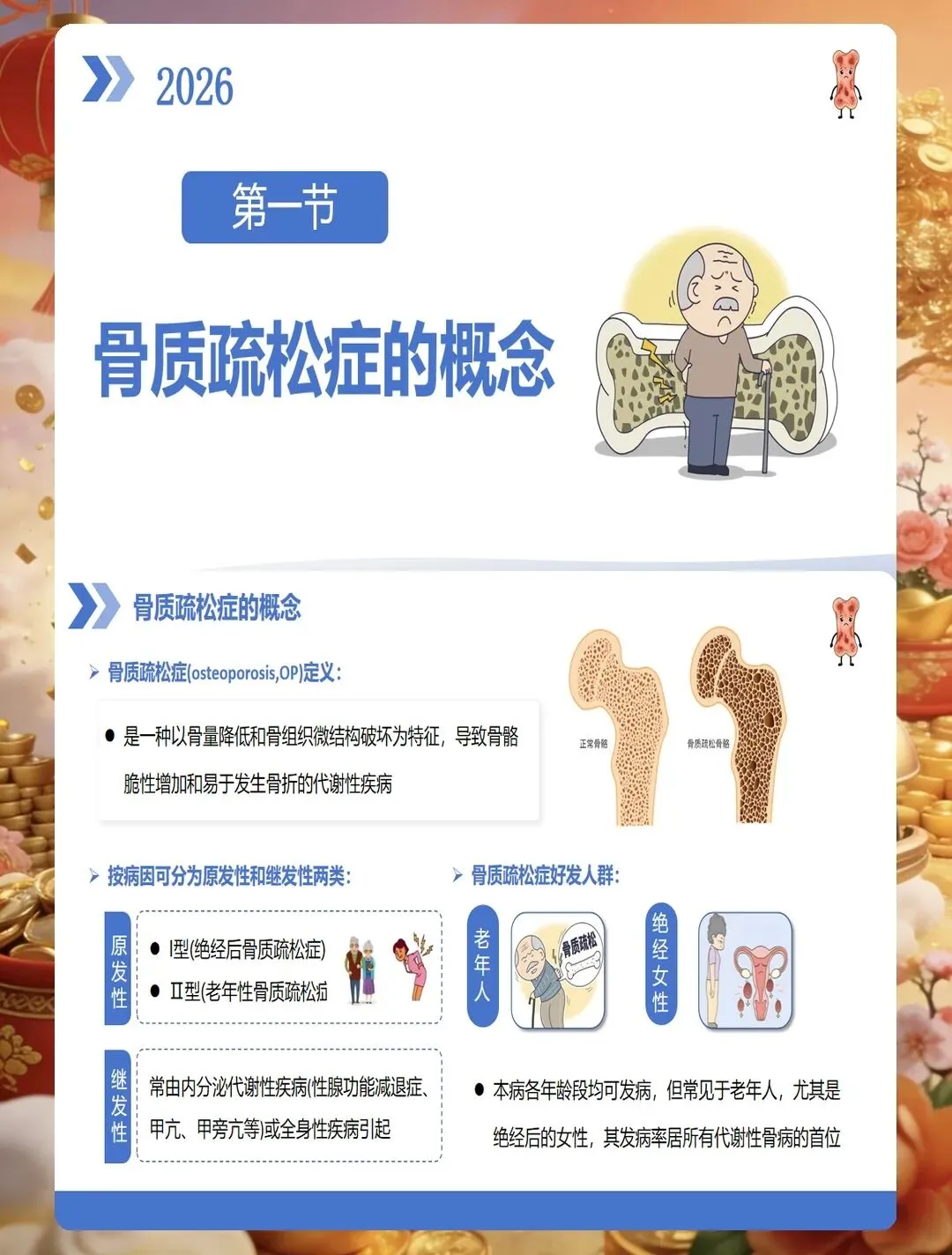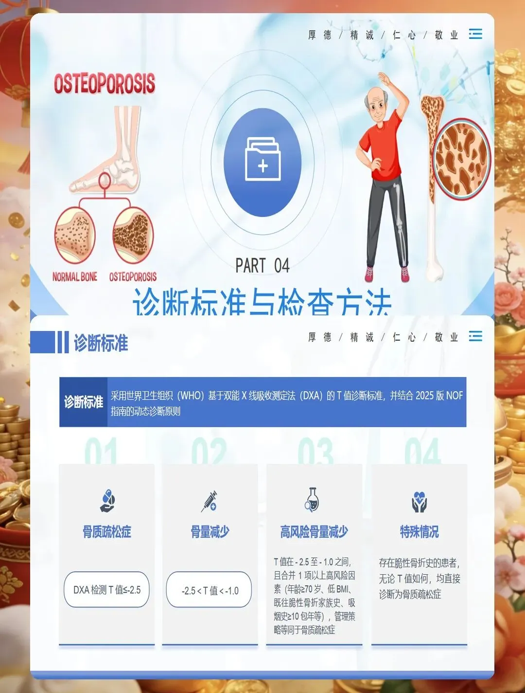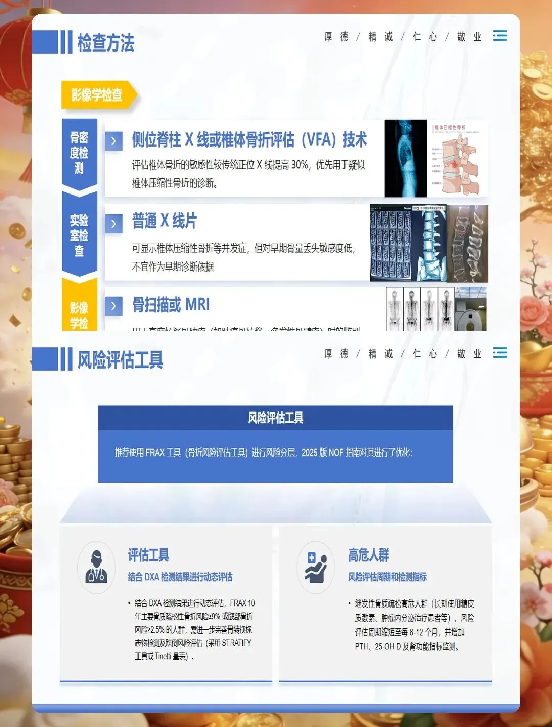 骨质疏松症是一种以骨量降低、骨组织微结构破坏为特征的代谢性骨骼疾病,已成为严重威胁中老年人健康的公共卫生问题。护理评估首先要识别高危人群,包括绝经后女性、老年人、长期使用糖皮质激素者、有脆性骨折家族史者、体重过低者、吸烟酗酒者、缺乏运动者以及患有影响骨代谢疾病的患者。评估工具方面,可采用国际骨质疏松基金会一分钟测试题或亚洲人骨质疏松自我筛查工具进行初步筛查,高风险患者需进一步行双能X线吸收测定法检测骨密度。