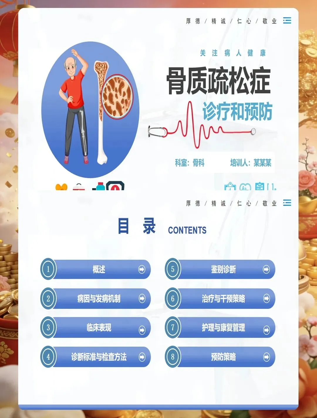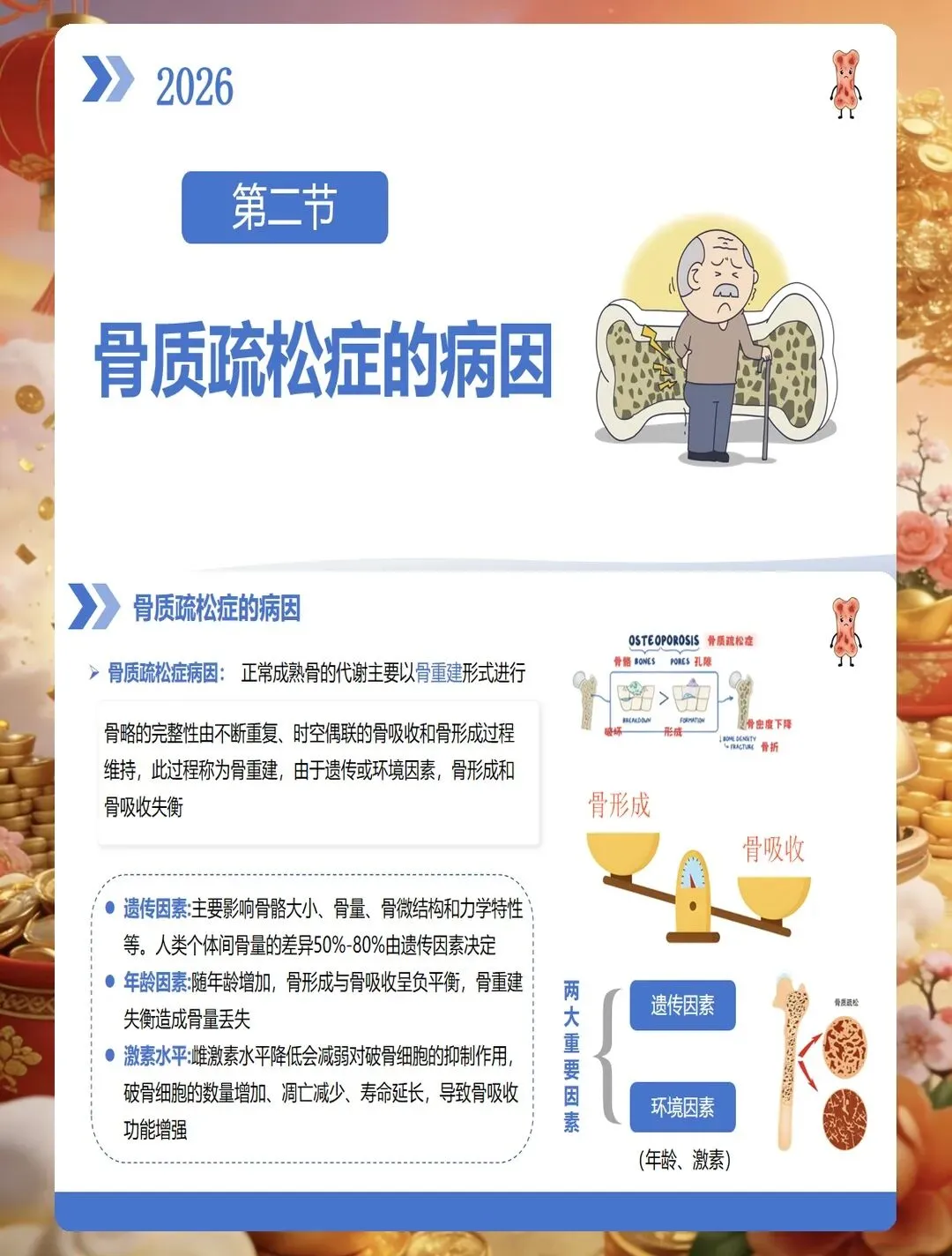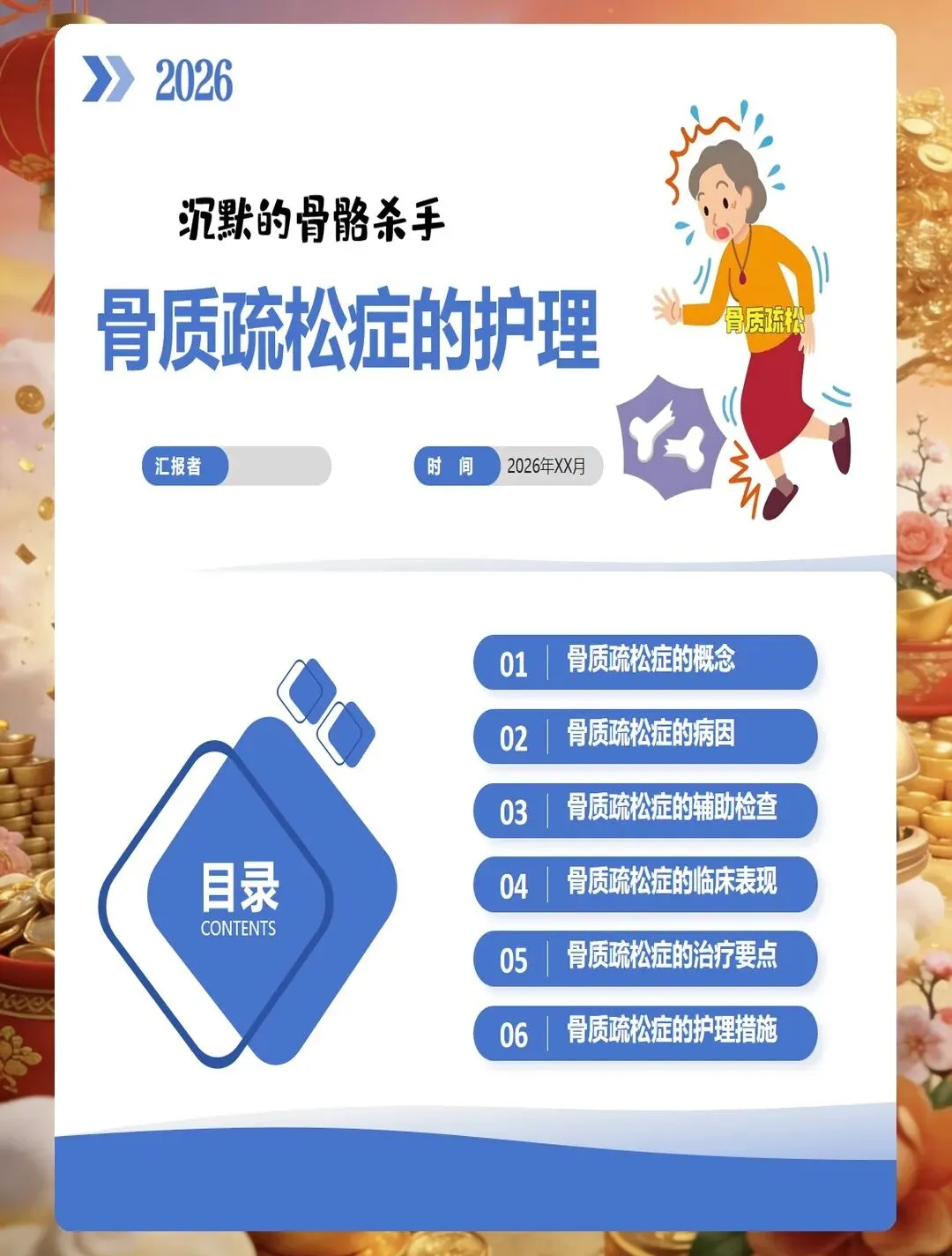 骨质疏松症是一种以骨量降低、骨组织微结构破坏为特征的代谢性骨骼疾病,已成为严重威胁中老年人健康的公共卫生问题。护理评估首先要识别高危人群,包括绝经后女性、老年人、长期使用糖皮质激素者、有脆性骨折家族史者、体重过低者、吸烟酗酒者、缺乏运动者以及患有影响骨代谢疾病的患者。评估工具方面,可采用国际骨质疏松基金会一分钟测试题或亚洲人骨质疏松自我筛查工具进行初步筛查,高风险患者需进一步行双能X线吸收测定法检测骨密度。