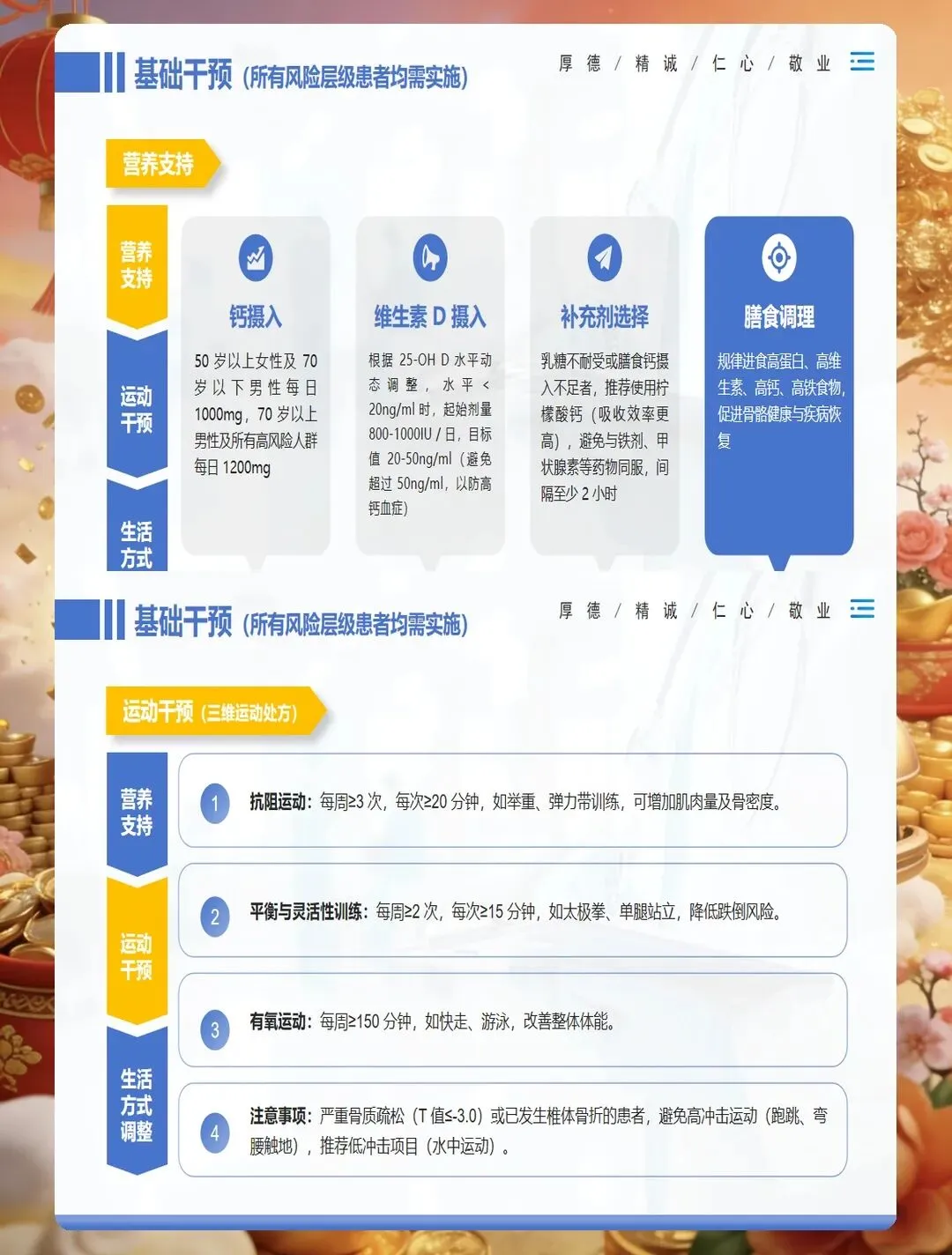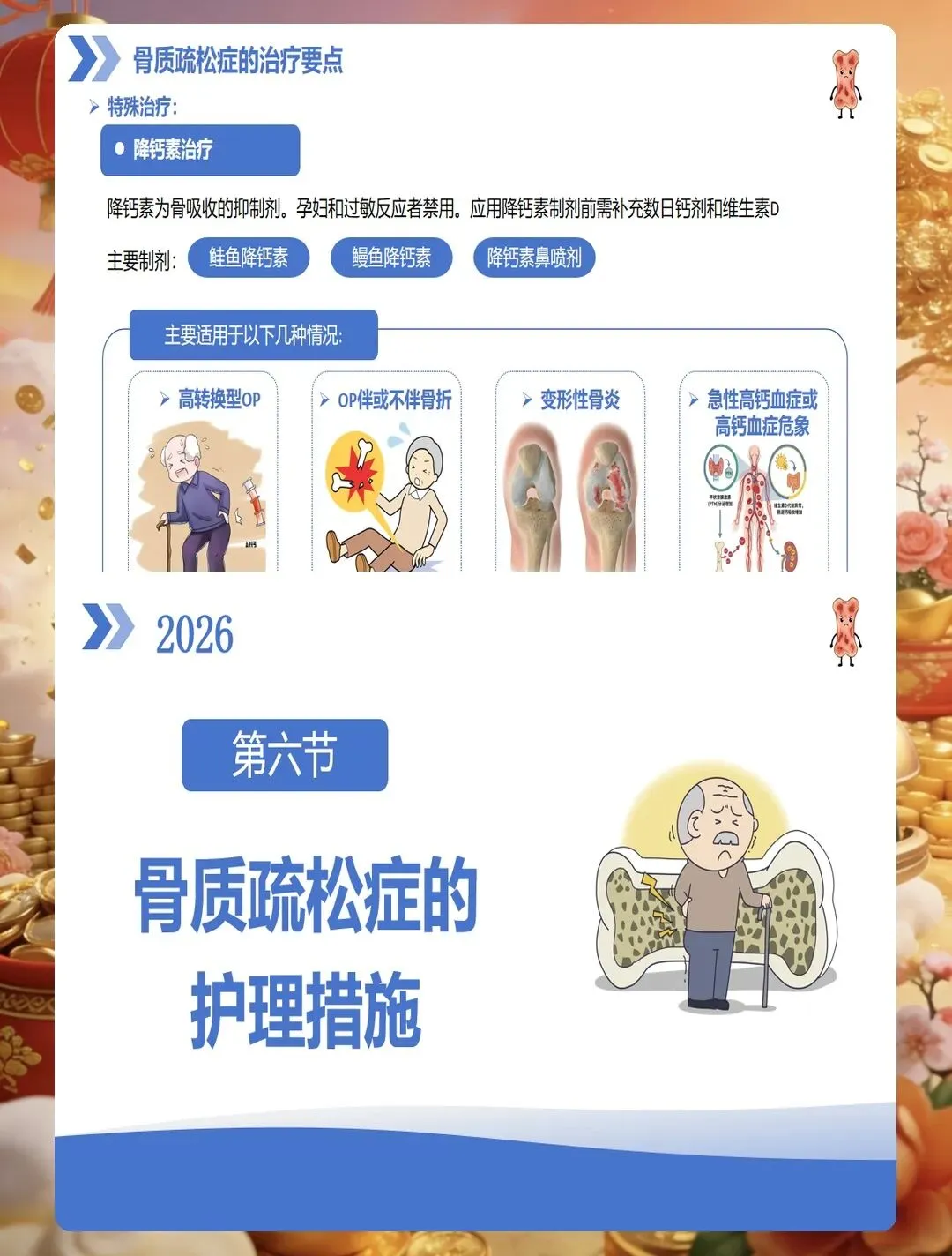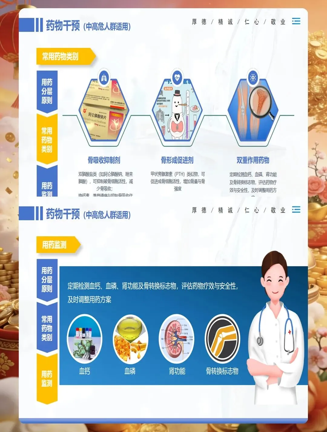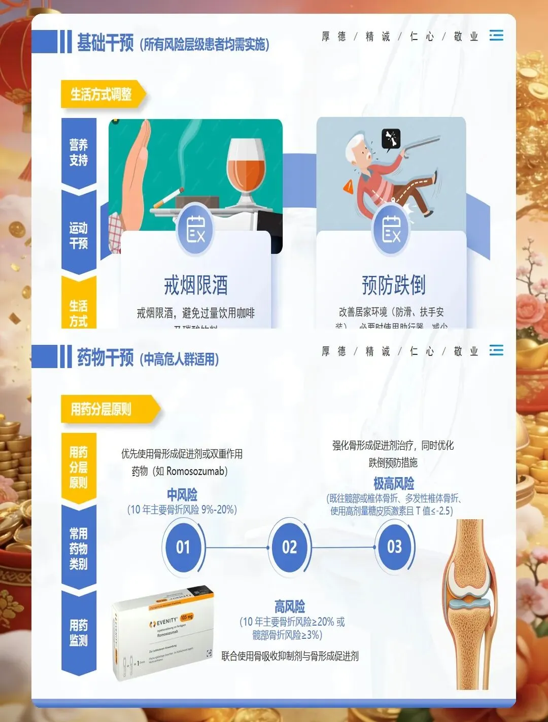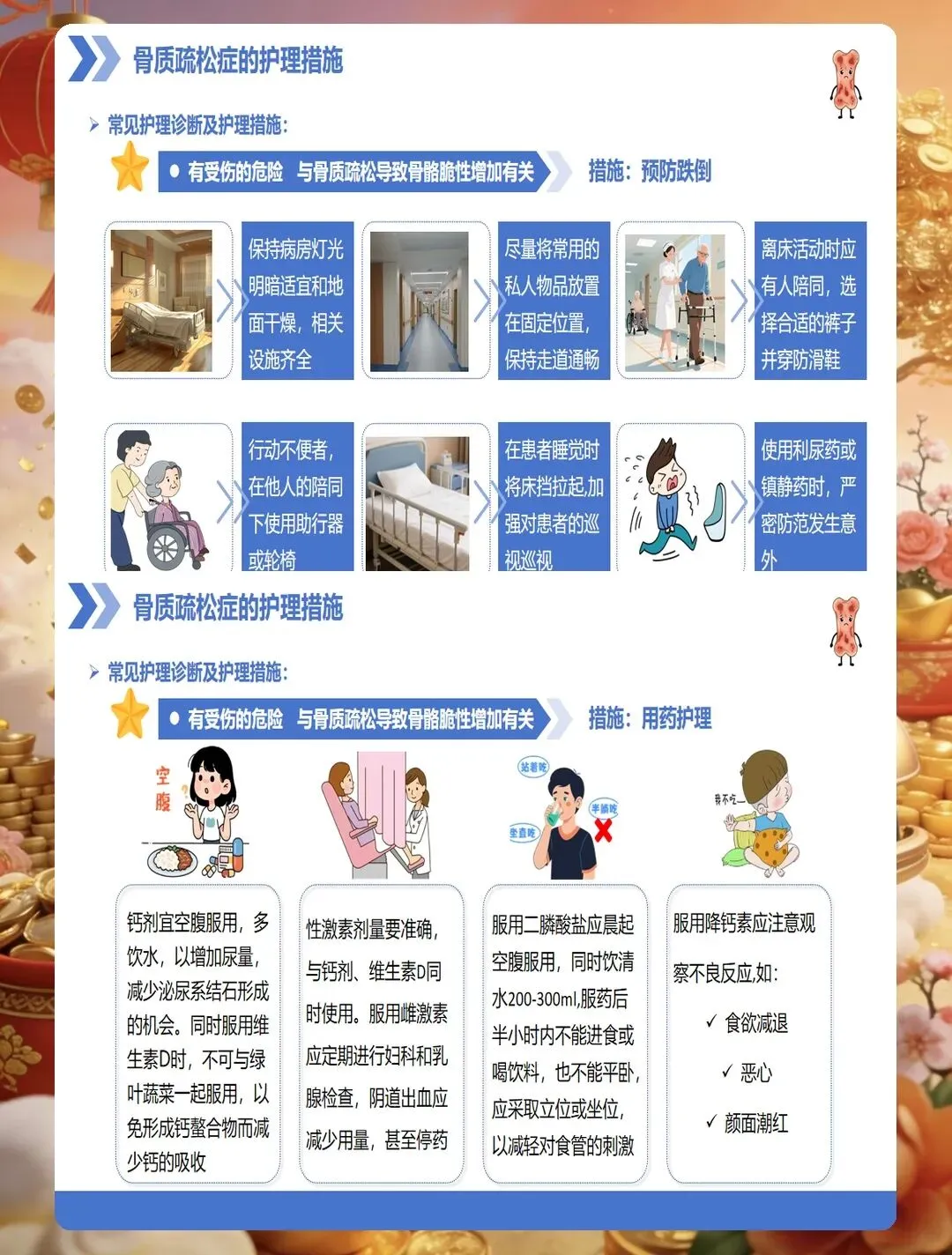 药物治疗是骨质疏松症管理的重要组成部分,护士要掌握常用药物的作用机制、用法用量及不良反应观察。钙剂和维生素D是基础用药,要告知患者最佳服用时间,钙剂宜在餐后或睡前服用,可减少胃肠道刺激,与维生素D同服可促进钙吸收。
