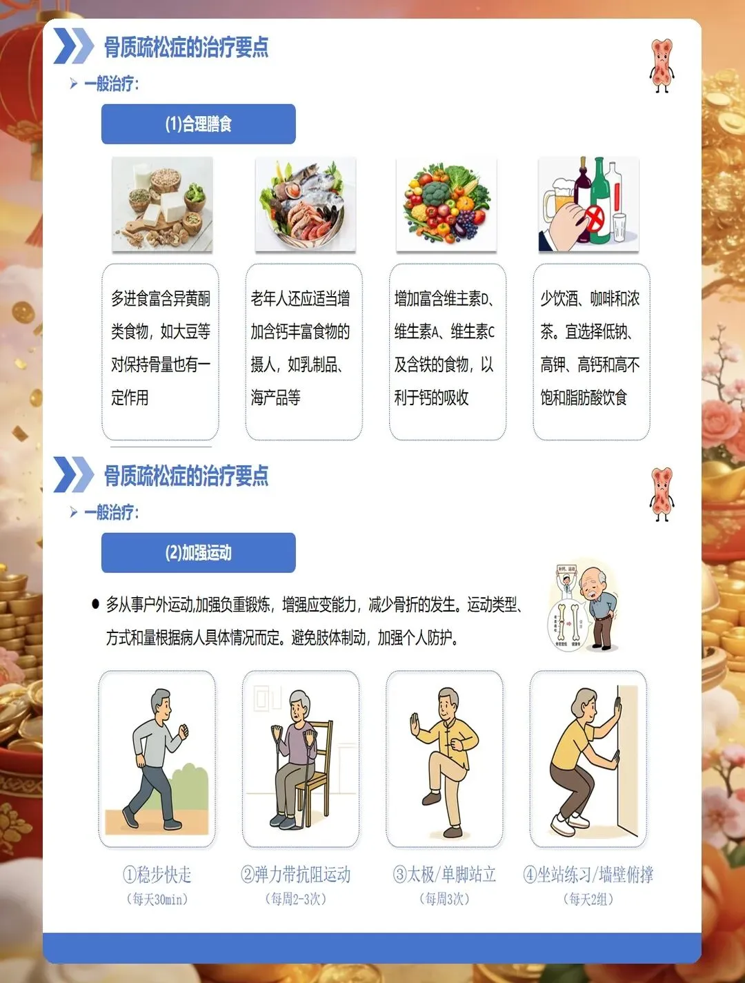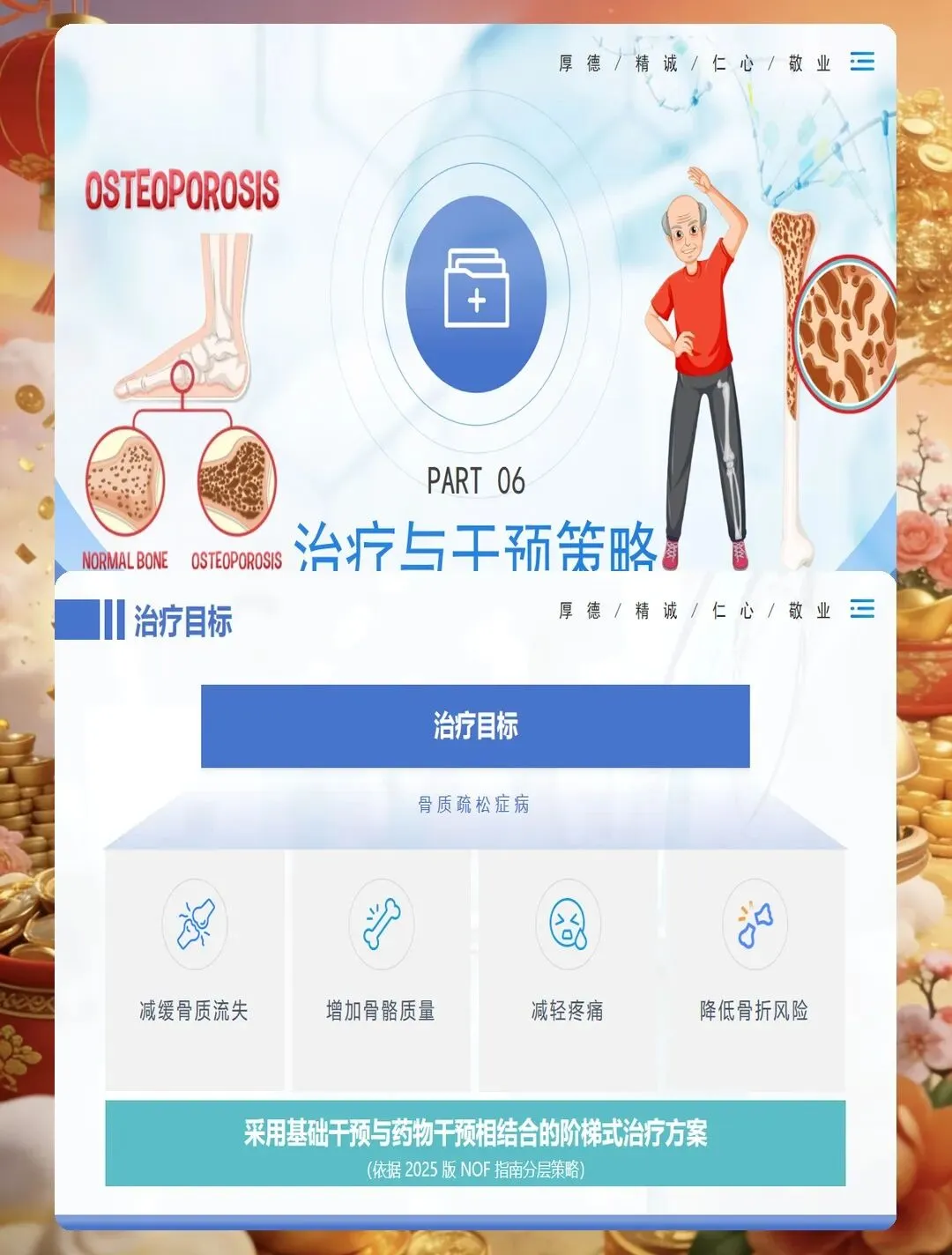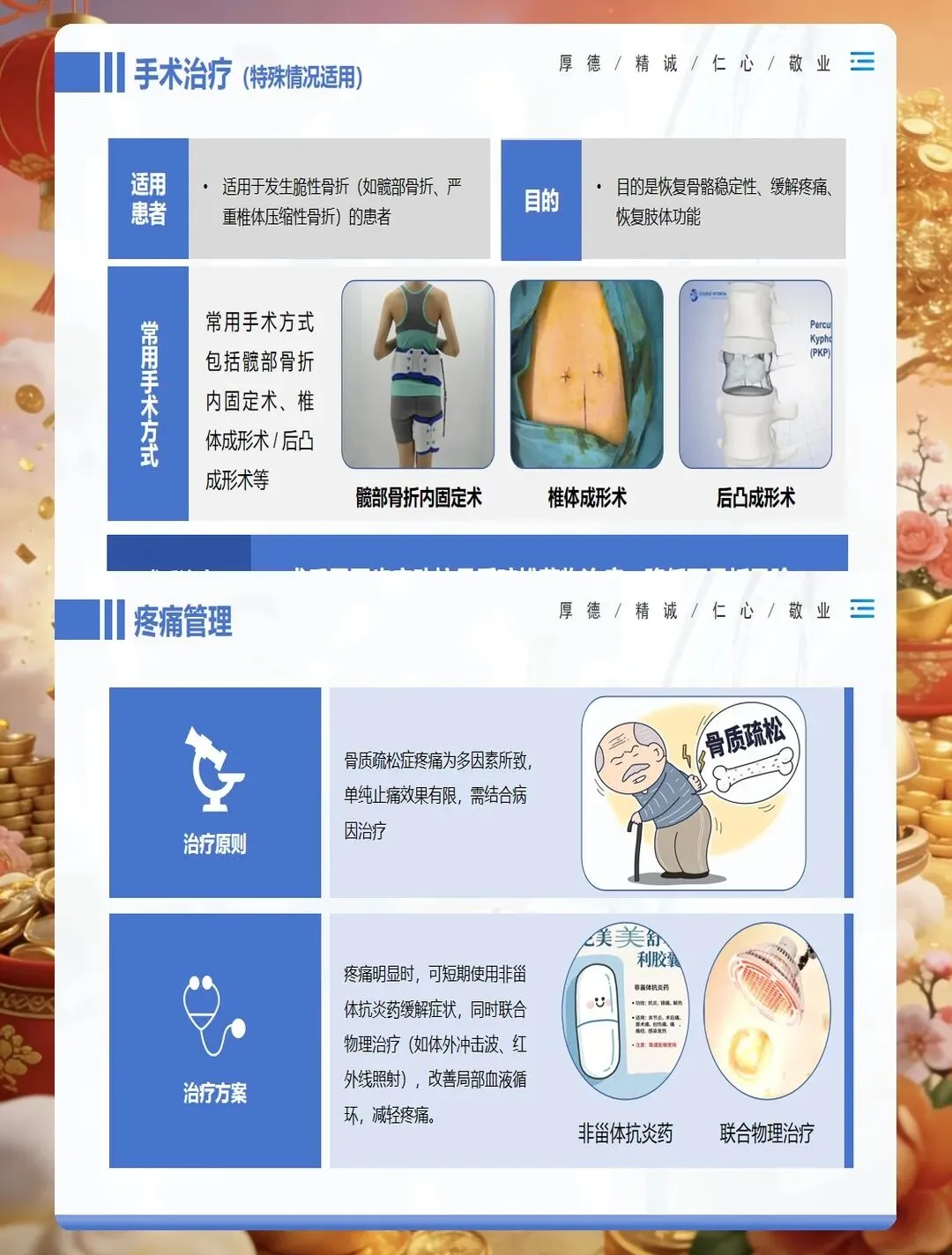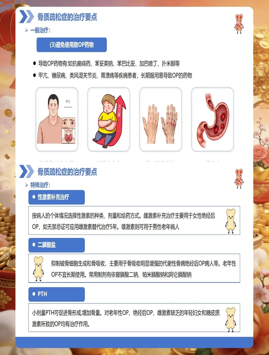 药物治疗是骨质疏松症管理的重要组成部分,护士要掌握常用药物的作用机制、用法用量及不良反应观察。钙剂和维生素D是基础用药,要告知患者最佳服用时间,钙剂宜在餐后或睡前服用,可减少胃肠道刺激,与维生素D同服可促进钙吸收。