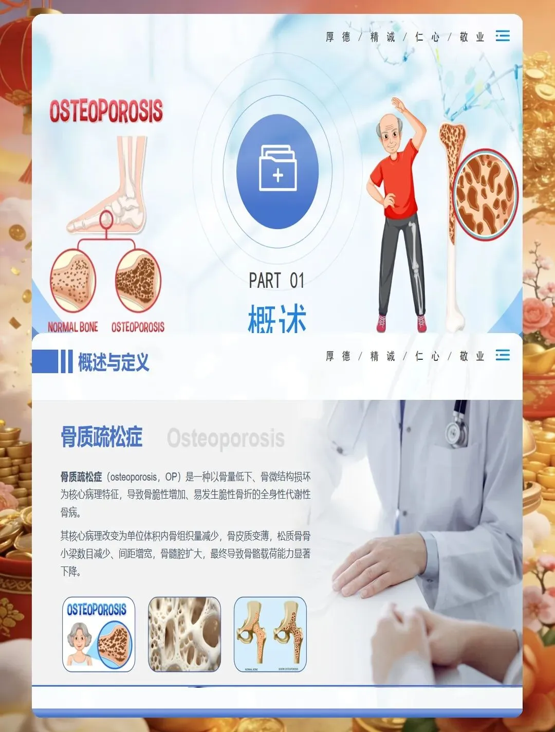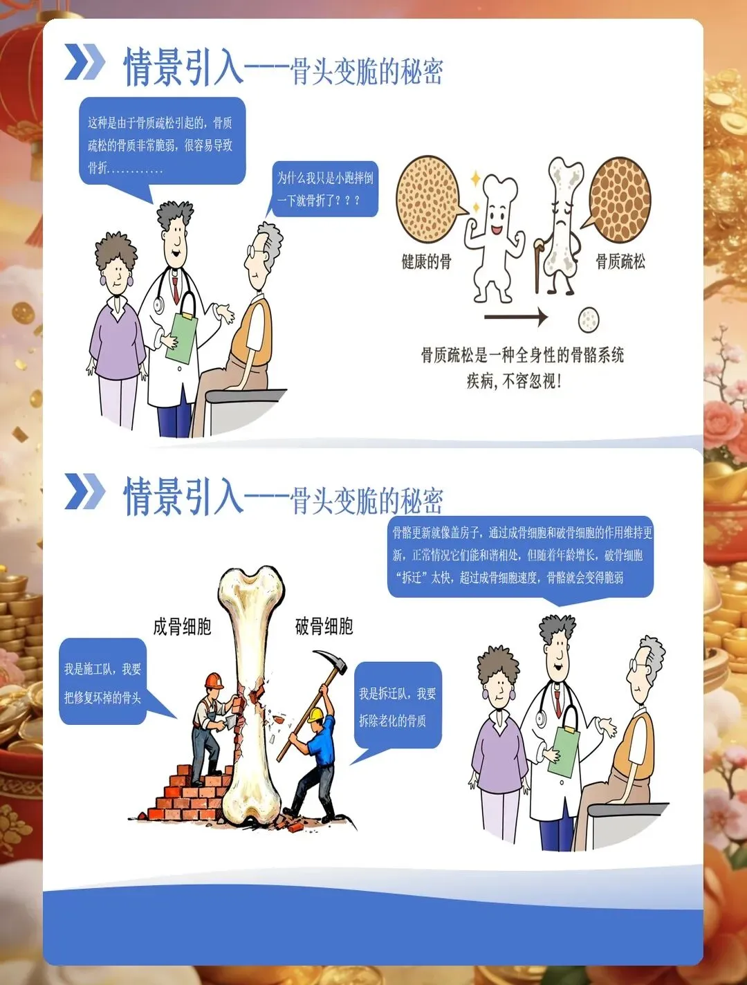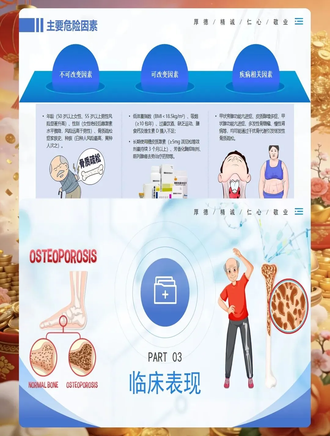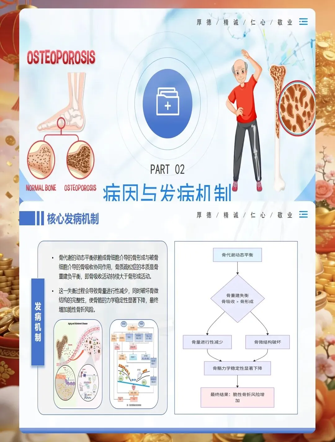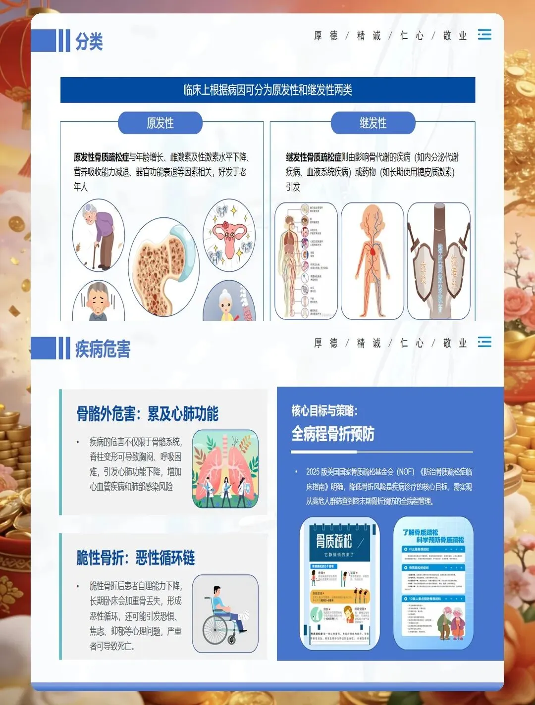 药物治疗是骨质疏松症管理的重要组成部分,护士要掌握常用药物的作用机制、用法用量及不良反应观察。钙剂和维生素D是基础用药,要告知患者最佳服用时间,钙剂宜在餐后或睡前服用,可减少胃肠道刺激,与维生素D同服可促进钙吸收。
