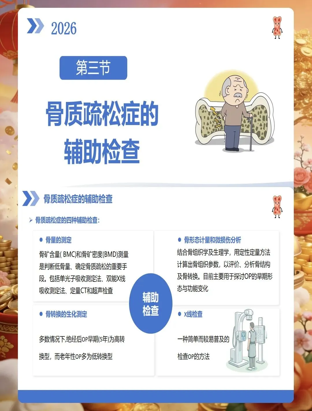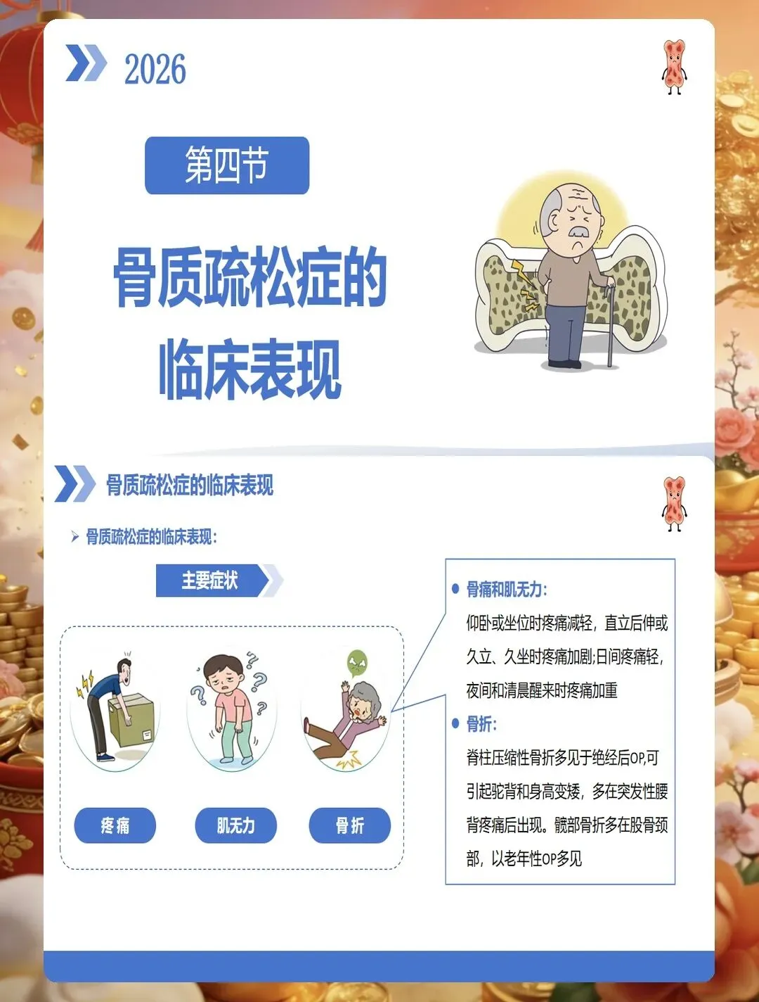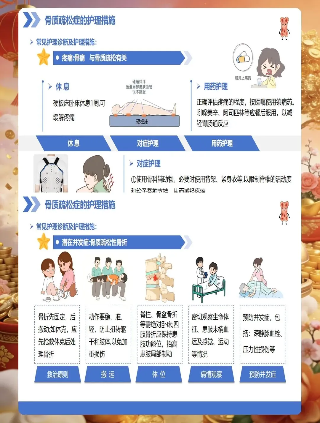 临床表现上,早期常无明显症状,部分患者出现腰背部酸痛、身高变矮、驼背等表现,严重者发生脆性骨折,以椎体骨折、髋部骨折、桡骨远端骨折最为常见。护理查房时要关注患者的疼痛特点、活动能力、跌倒风险评估,同时了解患者的饮食习惯、运动情况、日晒时间、用药史等。实验室检查需关注血钙、血磷、碱性磷酸酶、维生素D水平、骨转换标志物等指标,综合判断骨质疏松的类型和严重程度。