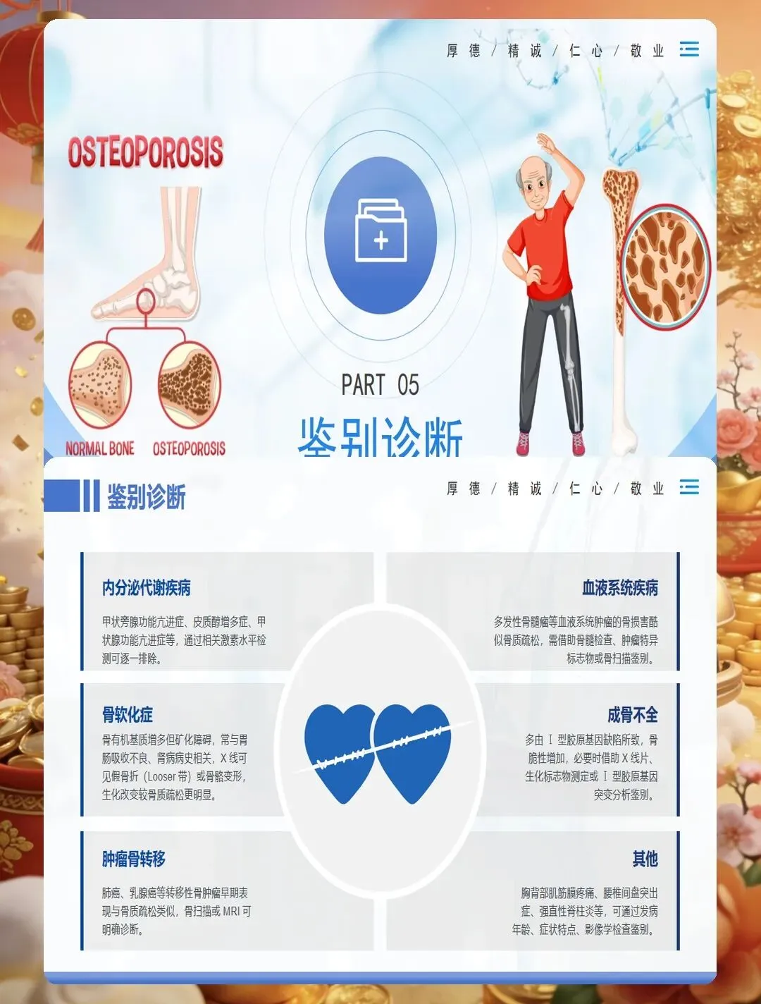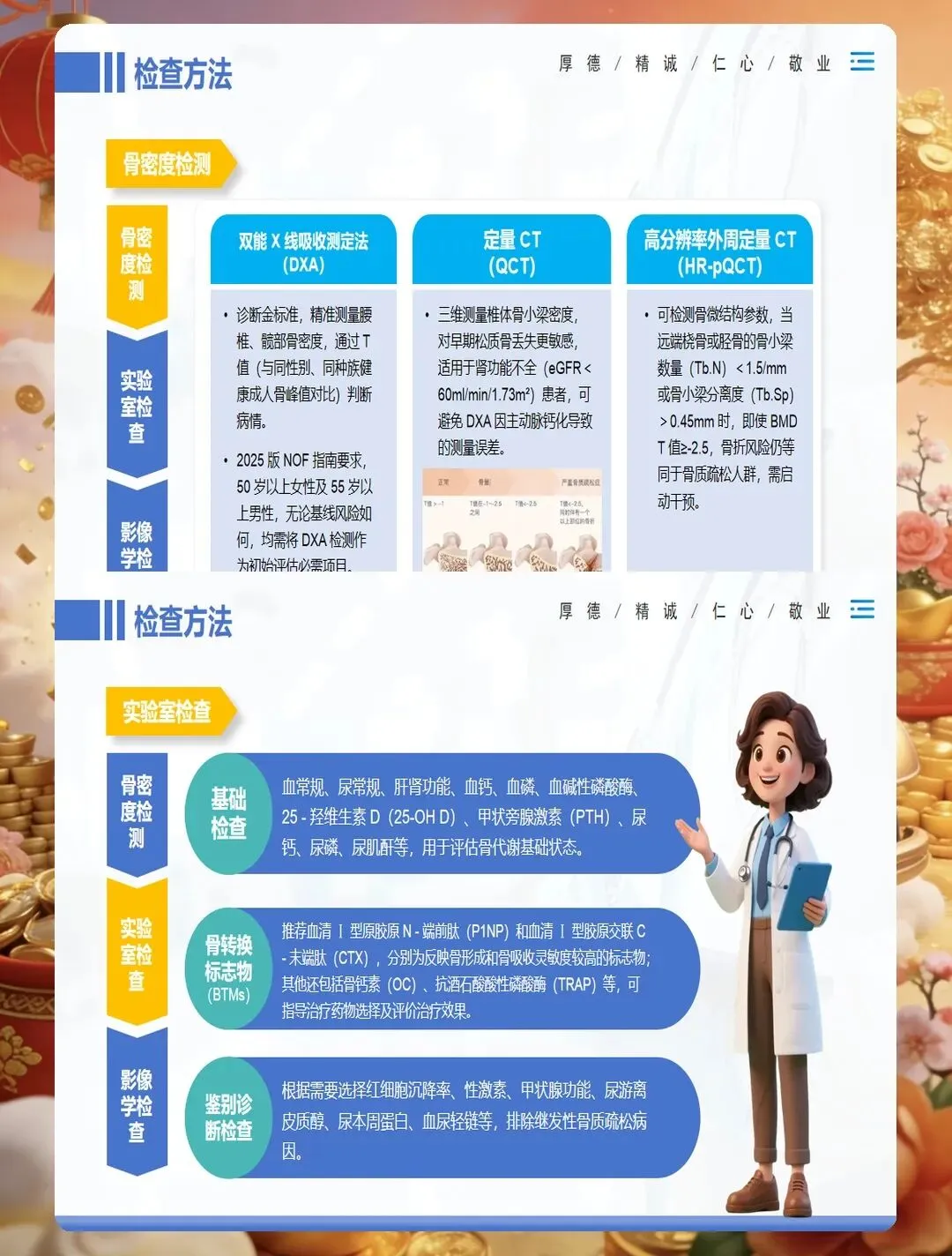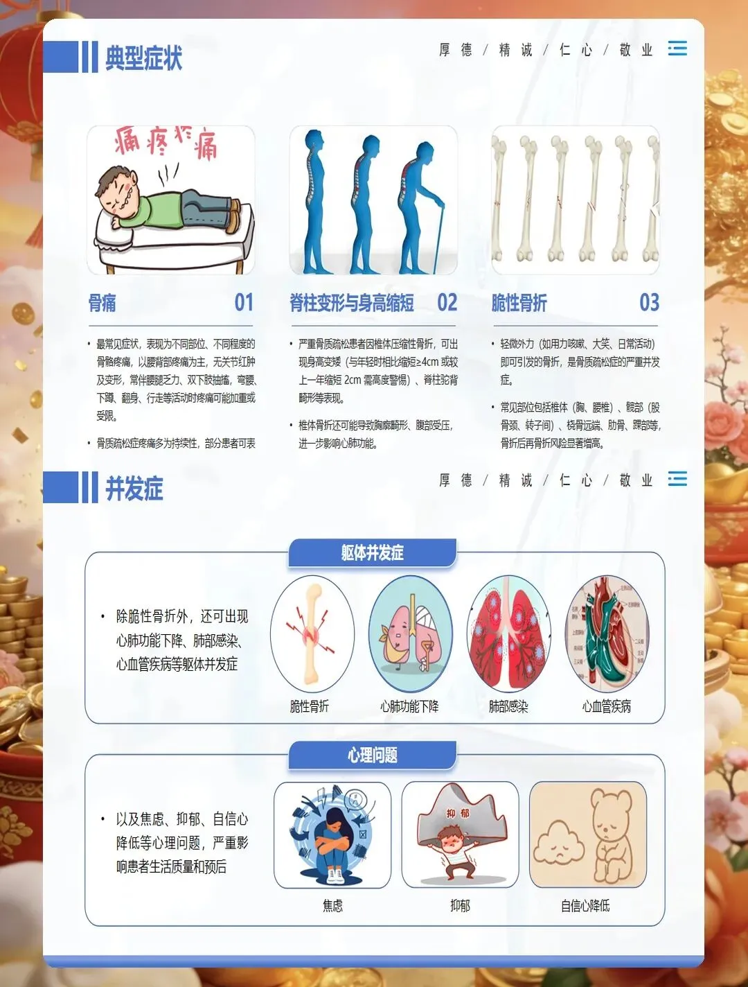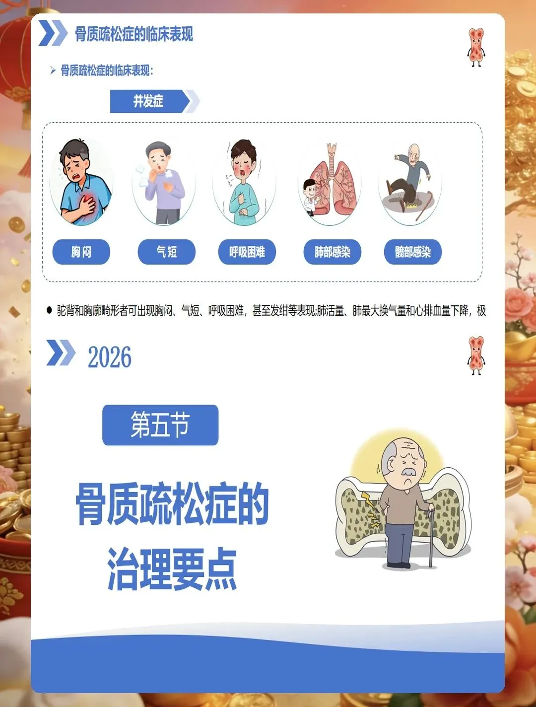 临床表现上,早期常无明显症状,部分患者出现腰背部酸痛、身高变矮、驼背等表现,严重者发生脆性骨折,以椎体骨折、髋部骨折、桡骨远端骨折最为常见。护理查房时要关注患者的疼痛特点、活动能力、跌倒风险评估,同时了解患者的饮食习惯、运动情况、日晒时间、用药史等。实验室检查需关注血钙、血磷、碱性磷酸酶、维生素D水平、骨转换标志物等指标,综合判断骨质疏松的类型和严重程度。