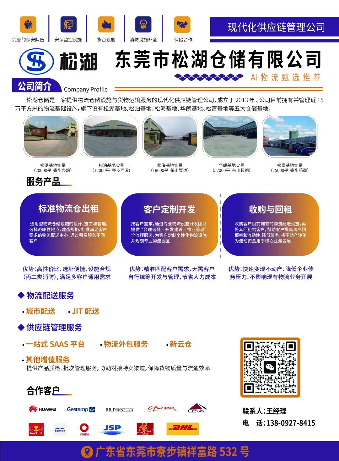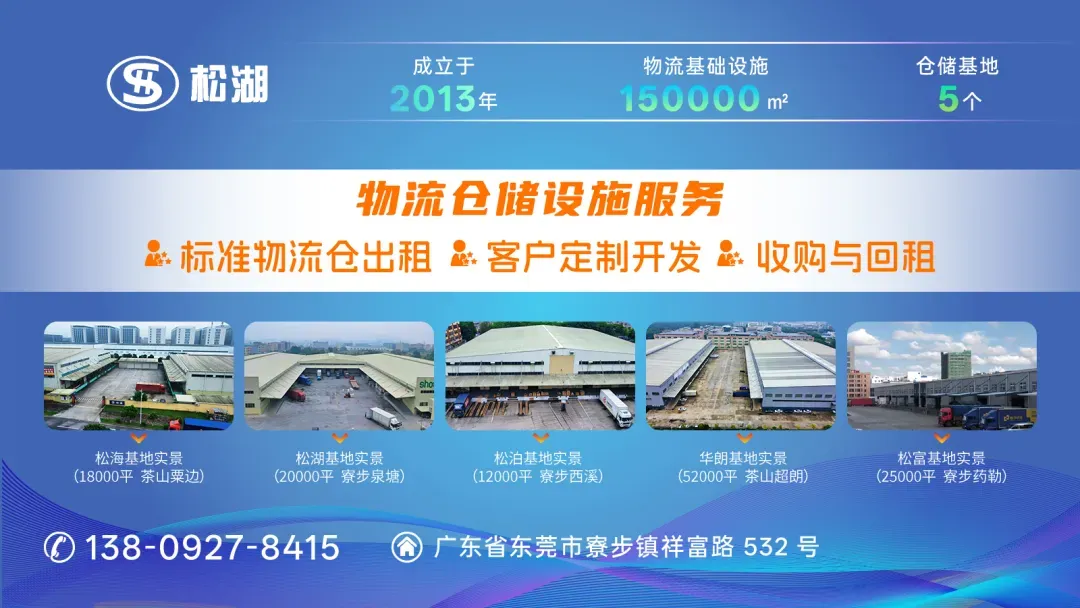 东莞市松湖仓储有限公司是东莞地区极具规模的专业仓储服务提供商,聚焦于为生产制造、物流运输及电商等领域企业提供高品质仓储解决方案。公司在东莞核心区域布局五大仓储基地,总占地面积达 12.7 万平方米,其中华朗基地以 5.2 万平方米的规模成为核心枢纽。基地分布于寮步(松湖、松泊、松富基地)和茶山(松海、华朗基地)两大产业集群区,紧邻松山湖科创圈及华为南方工厂,凭借 “双区域集群 + 临产业核心区” 的地理优势,为客户提供高效的供应链空间支撑。依托区域产业资源与智能化仓储潜力,公司已成为华为供应链上下游、跨境电商及合同物流企业的重要合作伙伴