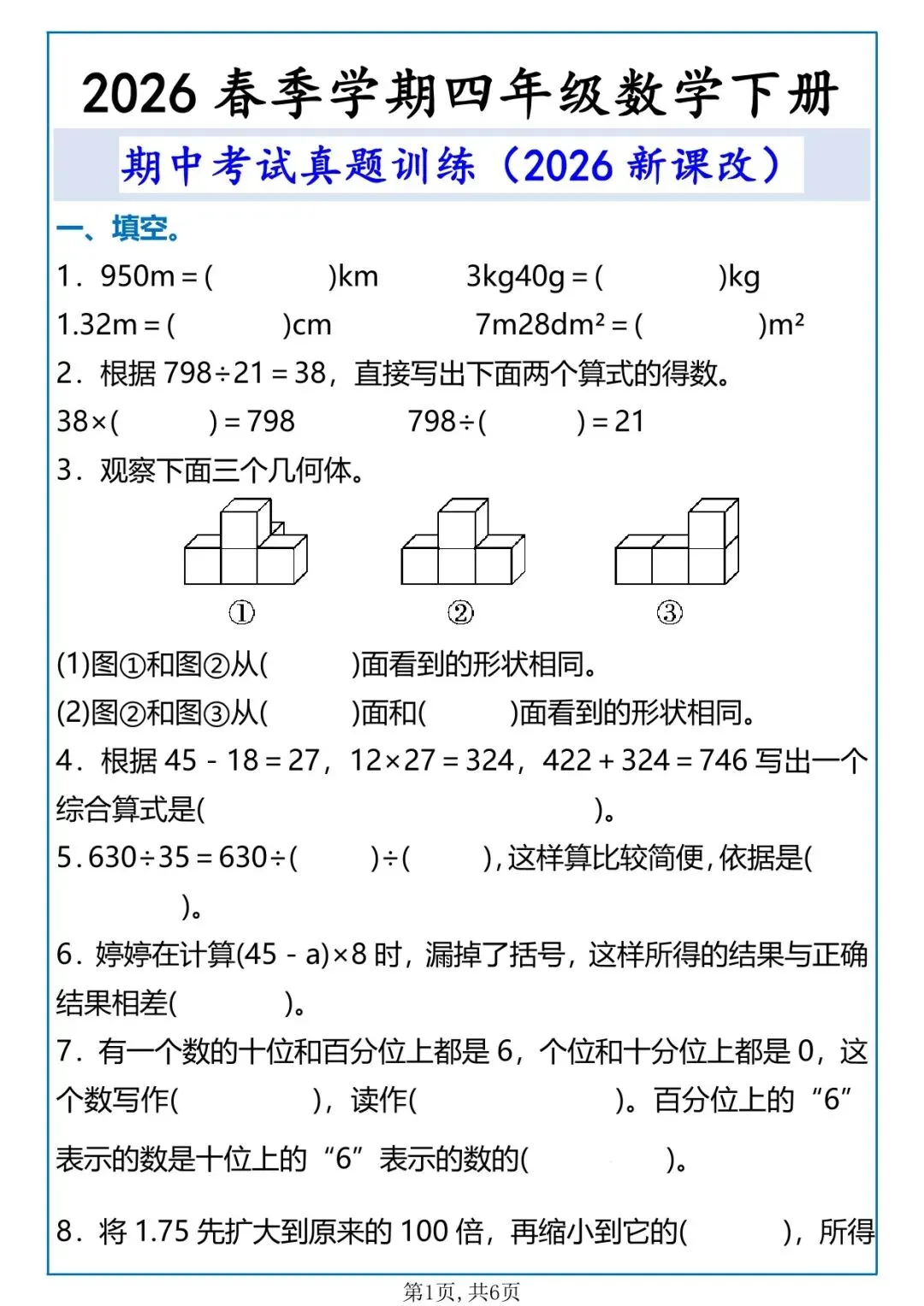 本资料为2026 年春季人教版四年级下册数学期中专用真题模拟卷,严格依据本学期期中命题范围编写,高度贴合校内考试题型、难度与分值结构,是期中考前冲刺、模拟自测、查漏补缺的核心复习资料。