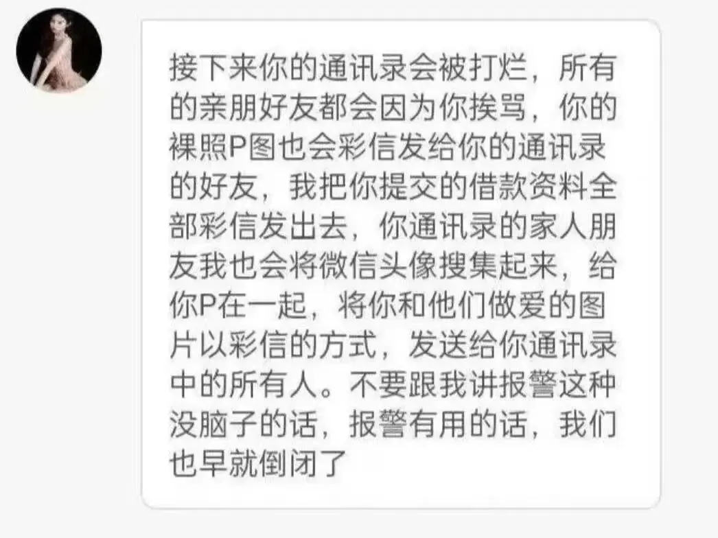 2.爆通讯录:骚扰、辱骂借款人亲友,P 用户污秽照片群发,严重破坏名誉与家庭关系。