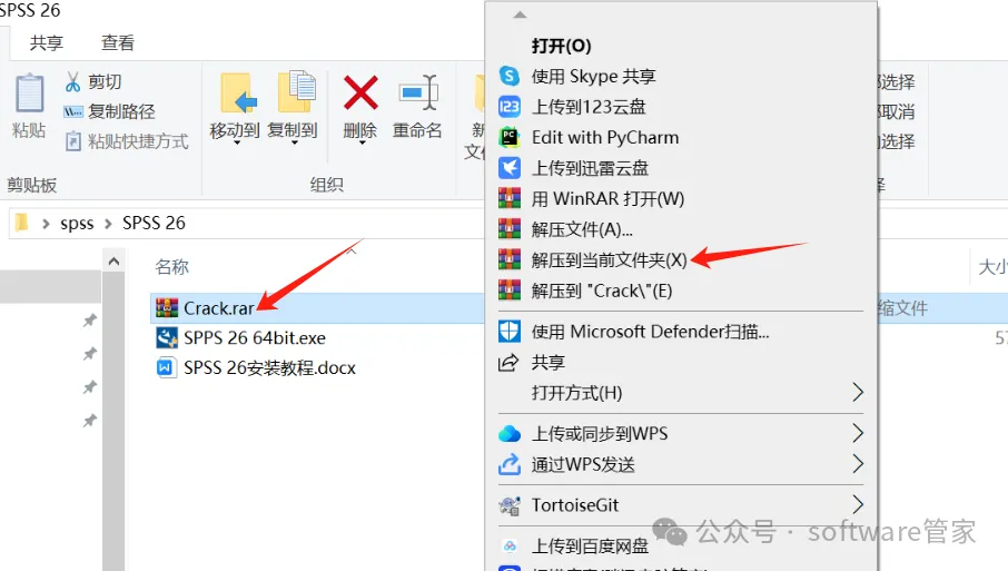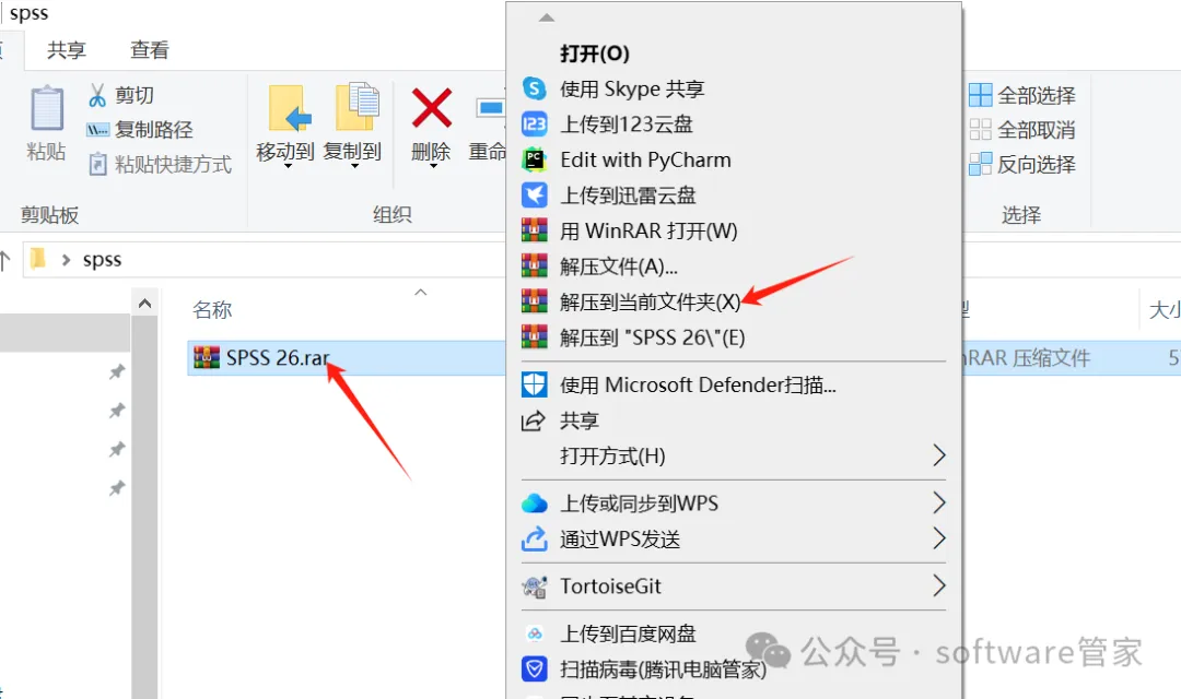 1.鼠标选中“SPSS 26.rar”右击解压到当前文件夹