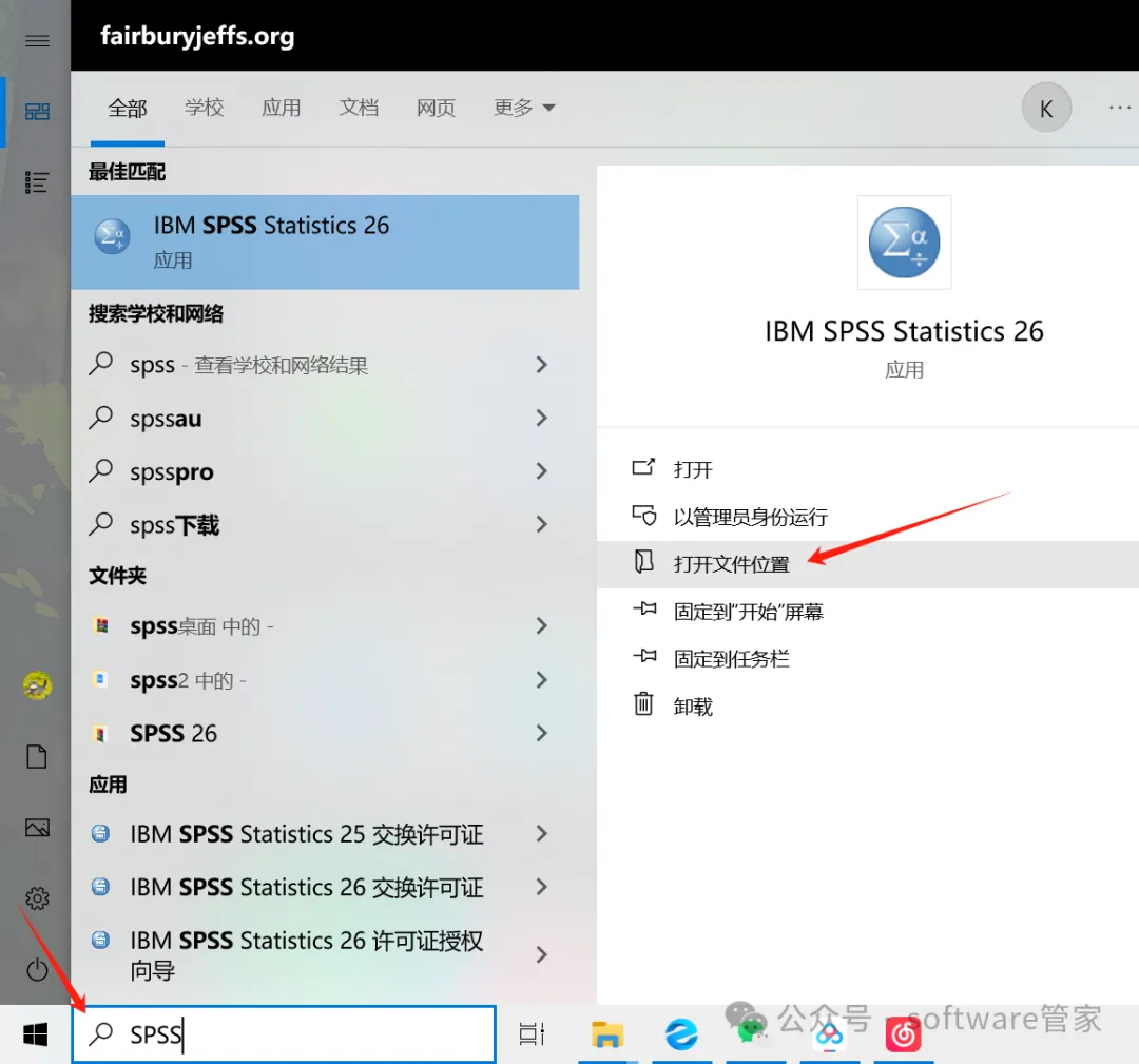 16. 在开始菜单,搜索spss找到“IBM SPSS Statistics 26”程序,选择“打开文件所在的位置”