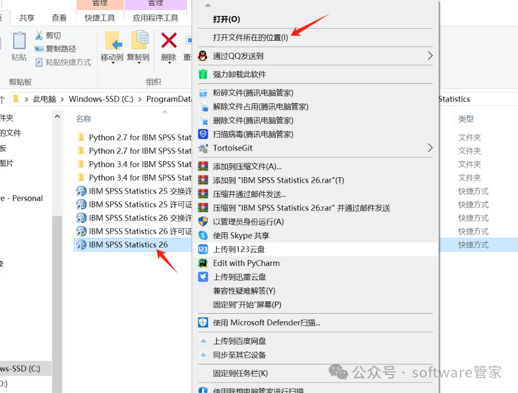 17. (此处若是快捷方式所在文件夹)找到“IBM SPSS Statistics 25”选中,右键选择“打开文件所在的位置”