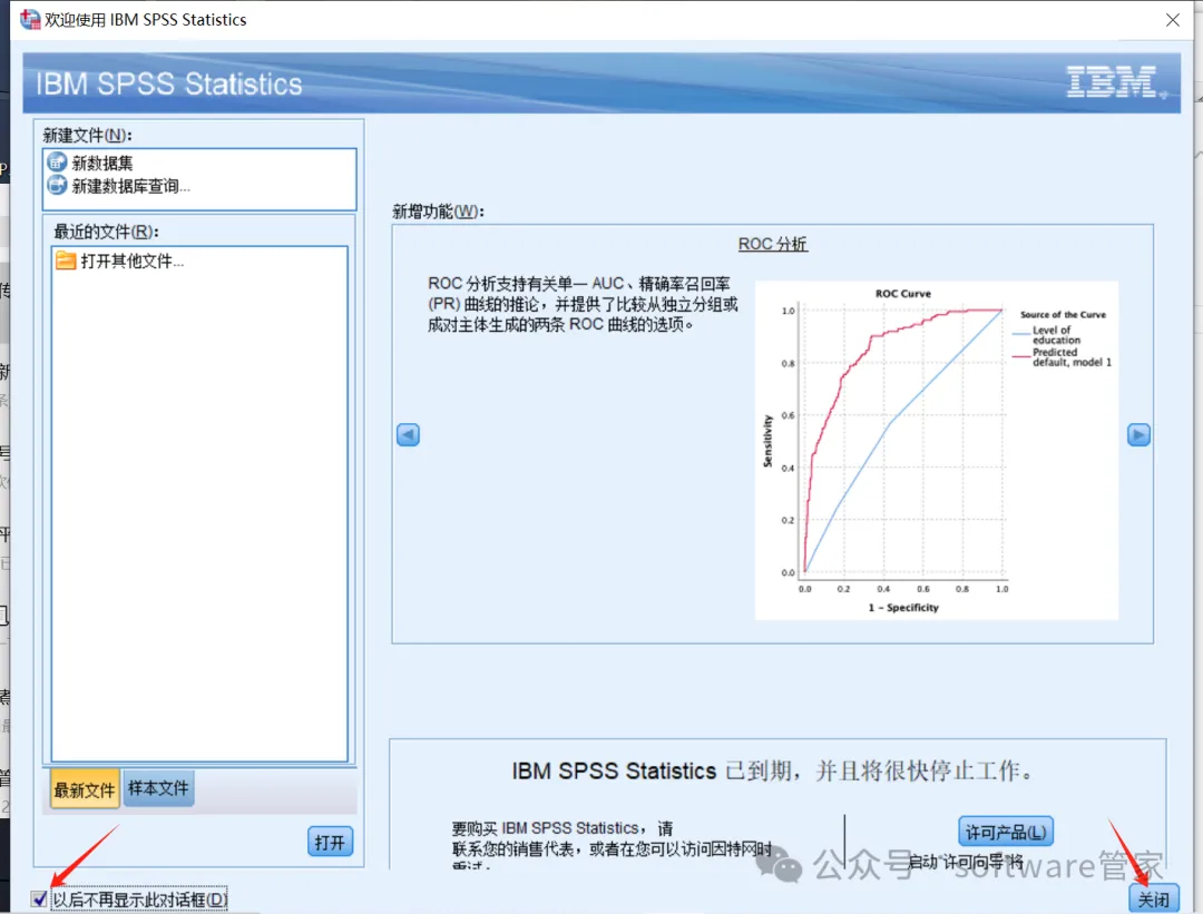 20. 在开始菜单,搜索spss找到“IBM SPSS Statistics 26程序,打开应用 ,勾选“以后不再显示此对话框”,点击“关闭”(不用理会提示,可一直正常使用)