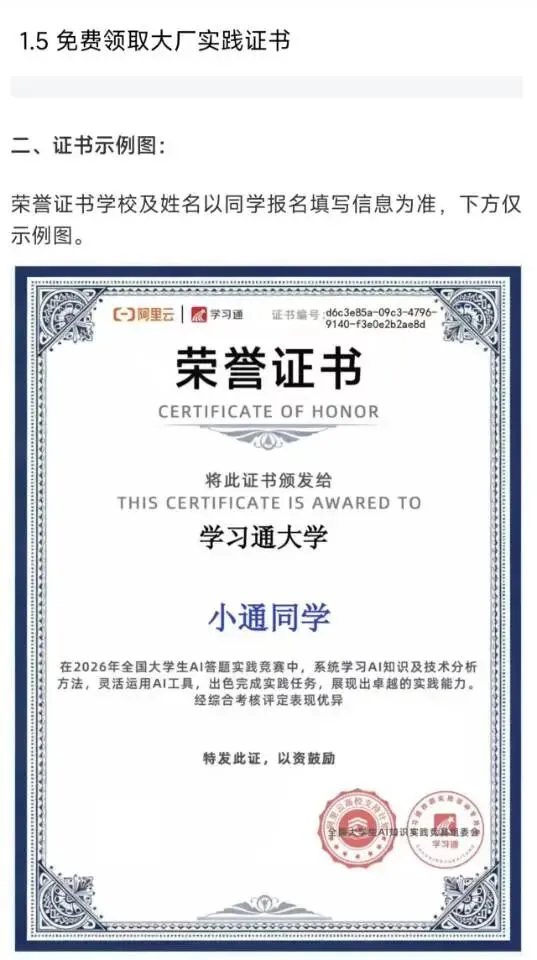 1.学习通搜索2026全国大学生AI答题实践竞赛,证书阿里云和学习通联合颁发的