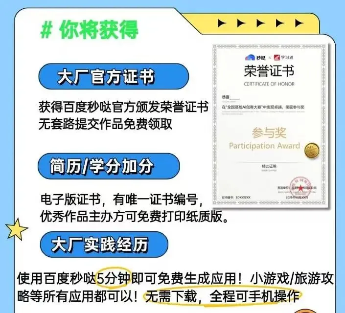 2.学习通搜索全国大学生0代码应用生成大赛,这是百度秒哒和学习通联合颁发的,生成的优秀作品最高还有2000元现金奖励
