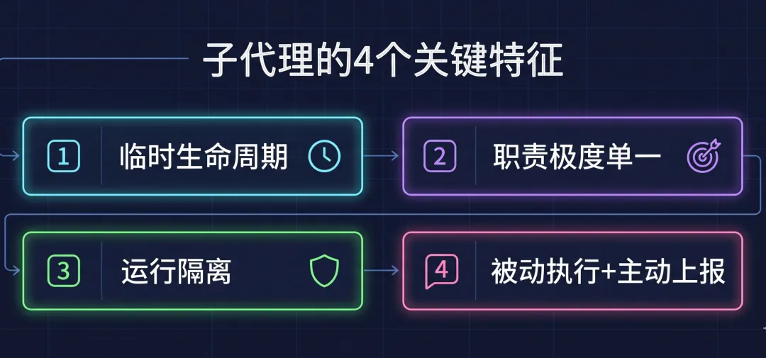子代理有4个关键特征,理解了你就知道它为什么比「大包大揽」更稳:
