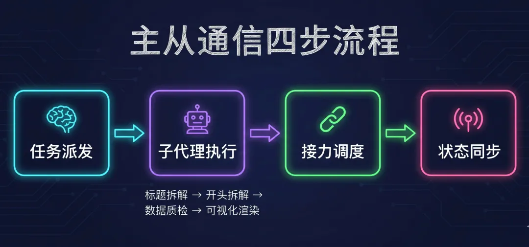 主代理严格遵守串联接力模式:总控初始化 → 标题拆解子代理 → 开头拆解子代理 → 数据质检 → 可视化渲染。