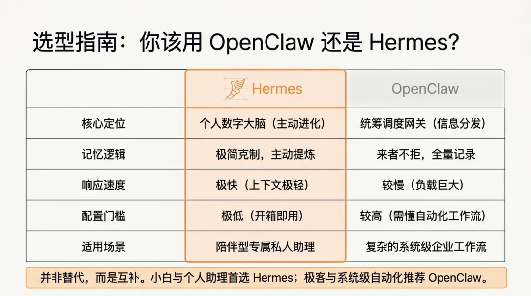 其实它们俩不是替代关系,而是互补。如果你是个纯小白,不想折腾复杂的配置,只想拥有一个能陪你成长、自动总结经验的助手,那直接闭眼用“爱马仕”。但如果你想搞复杂的自动化工作流,OpenClaw的生态会更丰富。OpenClaw像是一个负责系统调度的网关,而“爱马仕”更像是一个真正的大脑。