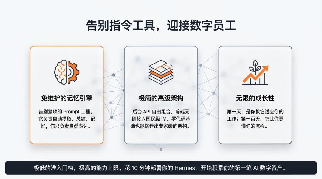 总而言之,“爱马仕”AI极大地降低了普通人拥有专属智能体的门槛。如果你也想给自己培养一个不用发工资、还会自动进化的数字小助手,非常推荐你去试一试!