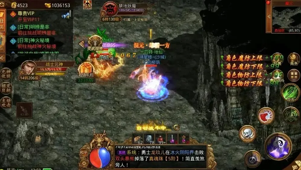 每周参与混沌争夺、异界乱斗、沙城攻城战,获取限定称号、高阶金装、龙魂材料。定期讨伐全服世界 BOSS,抢夺稀有裁决装备、高阶转生道具,组队协作爆率更高,多人配合轻松通关高难副本。