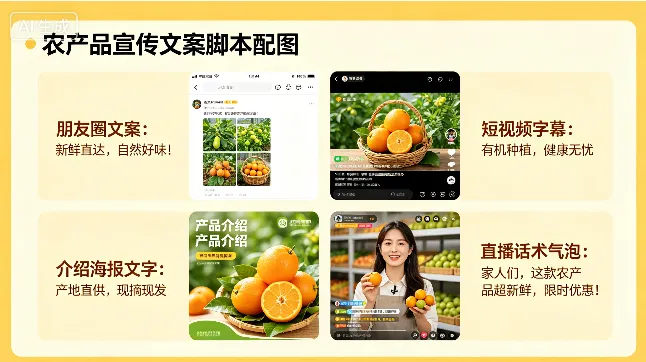 ◦ 文案/脚本:朋友圈、短视频、农产品介绍、直播话术。