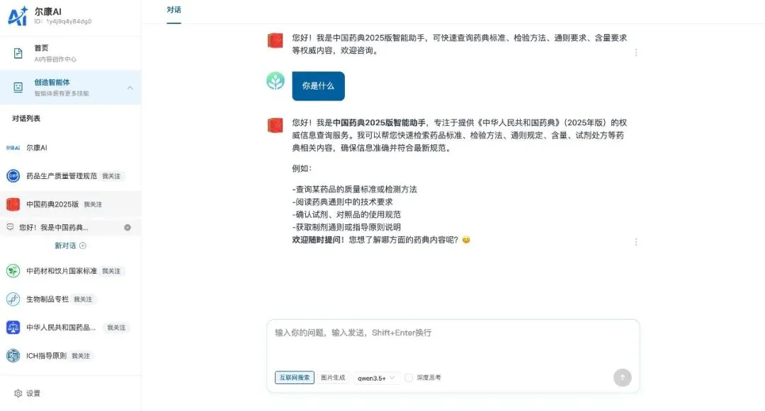 秒级定位核心信息:输入药品名称、标准项目即可一键定位对应内容,AI自动提炼核心要求,原本10分钟的翻找工作10秒即可完成,大幅减省时间成本; 支持自然语言提问,精准定位内容:哪怕是模糊的需求,比如“2025版药典新增了哪些对金银花的农药残留要求?”“化学药片剂的重量差异允差范围是多少?”,药典智能体都能准确理解你的问题,直接给出清晰结论,同时标注对应的法规来源,每一个结论都有据可依; 智能合规校验,提前规避风险:撰写检验SOP、梳理研发方案、更新体系文件时直接上传内容让AI核对,智能体会自动比对现行药典标准,指出不符合要求的内容,帮助企业提前排查合规风险,应对检查更从容。
