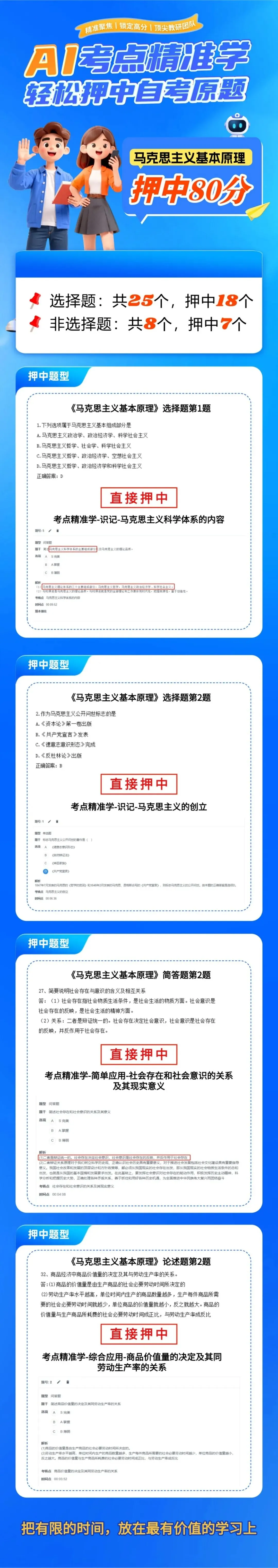 AI系统深度挖掘近十年自考真题,整合海量考试数据,通过复杂算法拆解命题规律、考点频次,结合最新教学大纲调整,精准锁定高频考点、必考考点,过滤90%无用内容。不用再整本啃书,不用再盲目刷题,把时间花在“必考点”上,备考效率直接拉满。
