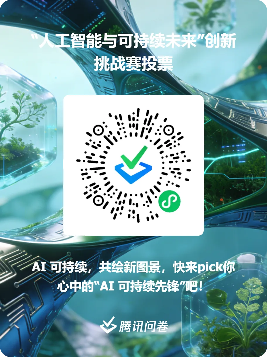 现在,我们将开启大众投票七组提案作品通道,获票数最高的人气竞赛组将获「AI 可持续先锋 • 人气大奖」!AI 可持续,共绘新图景!快来为你心中的青年创新者撑腰,为他们的可持续创意加冕!