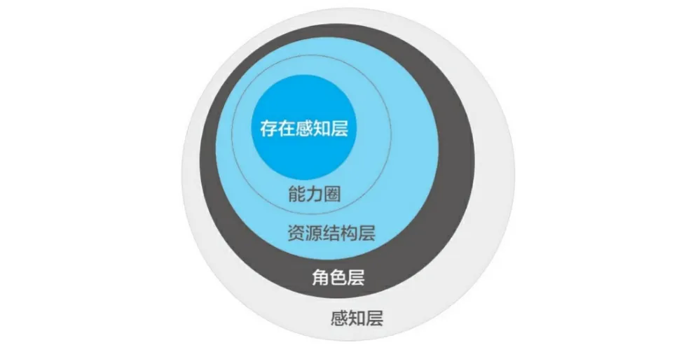 最外面一层叫感知层,就是你给人的第一印象,高矮胖瘦,整体气质。再往里一层叫角色层,你在哪家公司,担任什么职务,结没结婚。再往里是资源结构层,你的财富、人脉、精神资源。再往里是能力圈,你的管理能力、商业能力、专业技能。