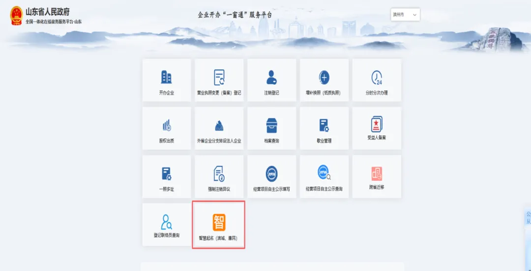 打开山东省政务服务网,选择滨州市滨城区站点,进入企业开办“一窗通”服务平台后,选择“智慧起名”(滨城)模块。