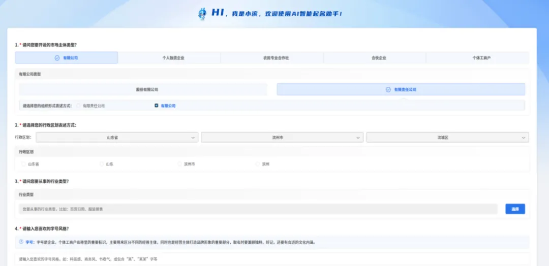选择市场主体类型,行政区划,行业类型,输入喜欢的字号风格。