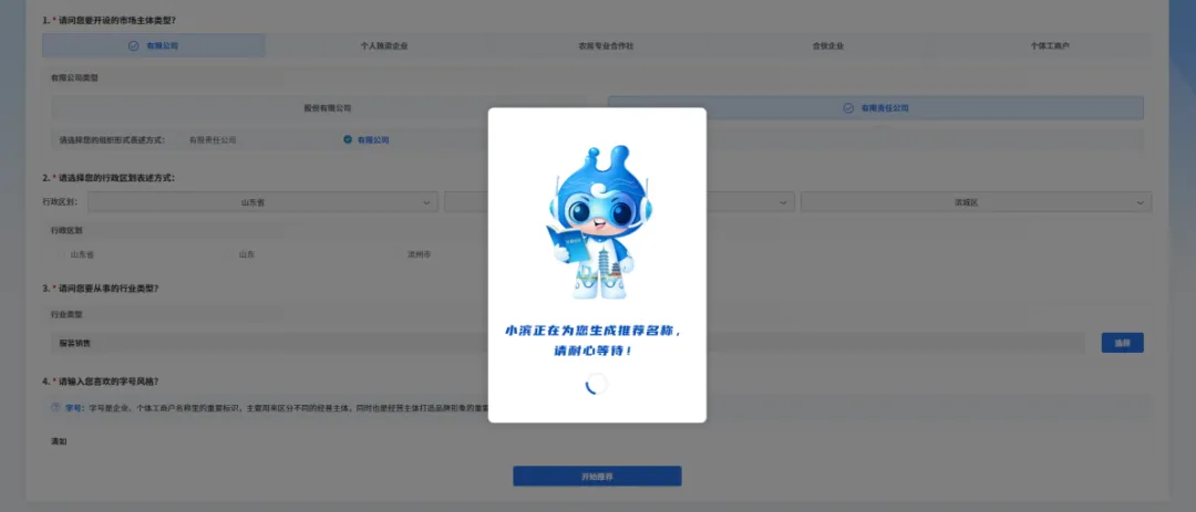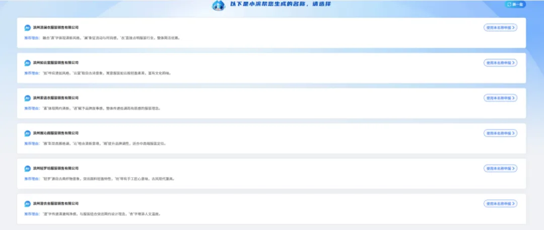 近日,滨城区企业开办“一窗通”服务平台正式上线“智慧起名”模块,该系统依托权威名称数据库与智能算法,精准对接名称禁限用规则及查重要求,实现智能化推荐、自动化筛查。申请人只需输入意向字号、行业类别等信息,系统便可快速生成一批合规、响亮、通过率高的企业名称,并同步完成重名比对,从源头减少申报驳回情况。相较于传统人工核名模式,全程线上办理、无需反复跑腿,显著压缩企业开办时间,降低创业准入成本。