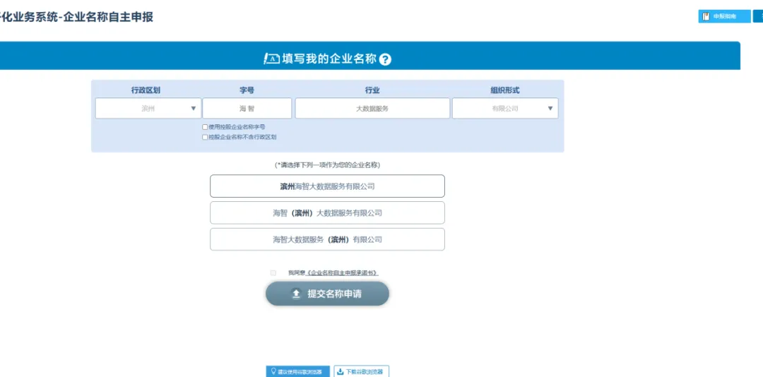 选择意向名称,进行名称自主申报。