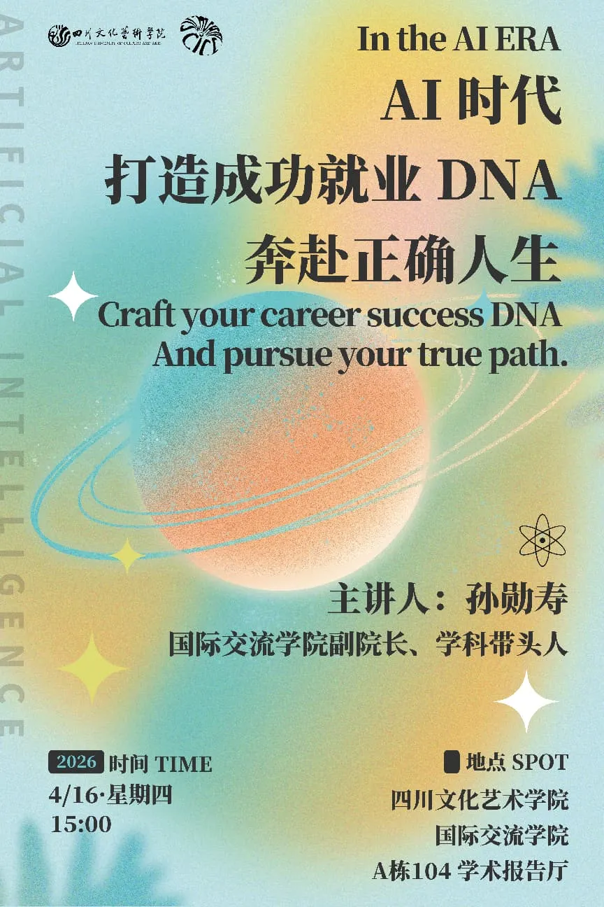 4月17日,国际交流学院在A幢104学术报告厅举办《AI时代,打造成功就业DNA,奔赴正确人生》专题讲座。国际交流学院副院长、学科带头人孙勋寿教授担任主讲,为全院学生解读智能时代核心竞争力与职业发展路径。